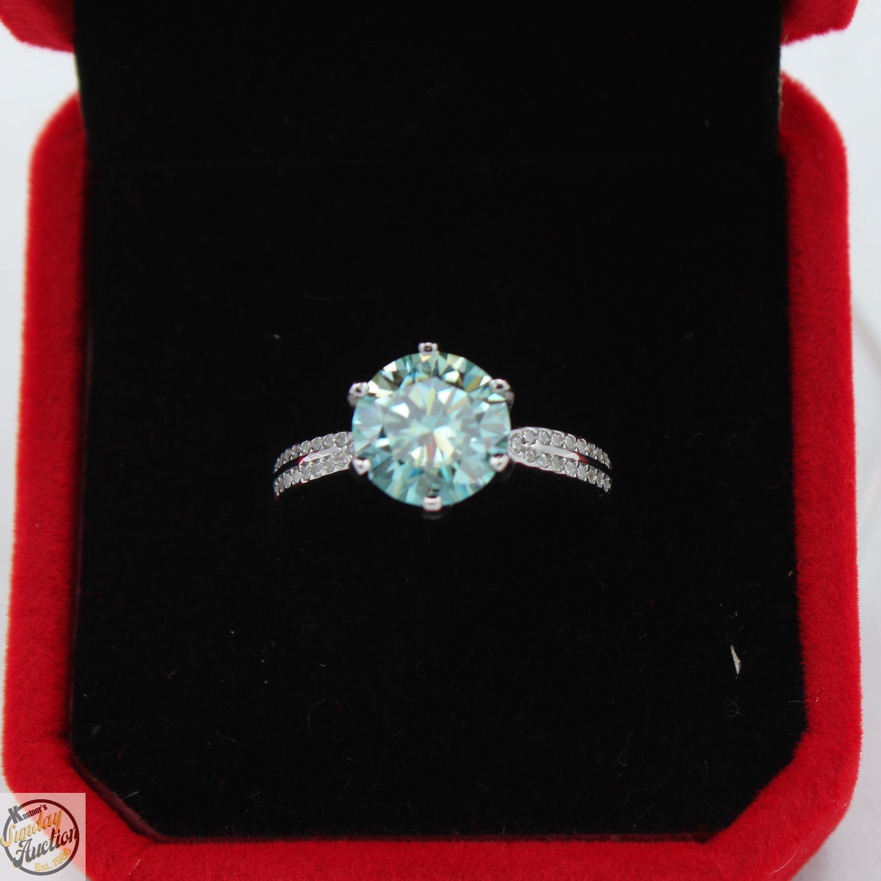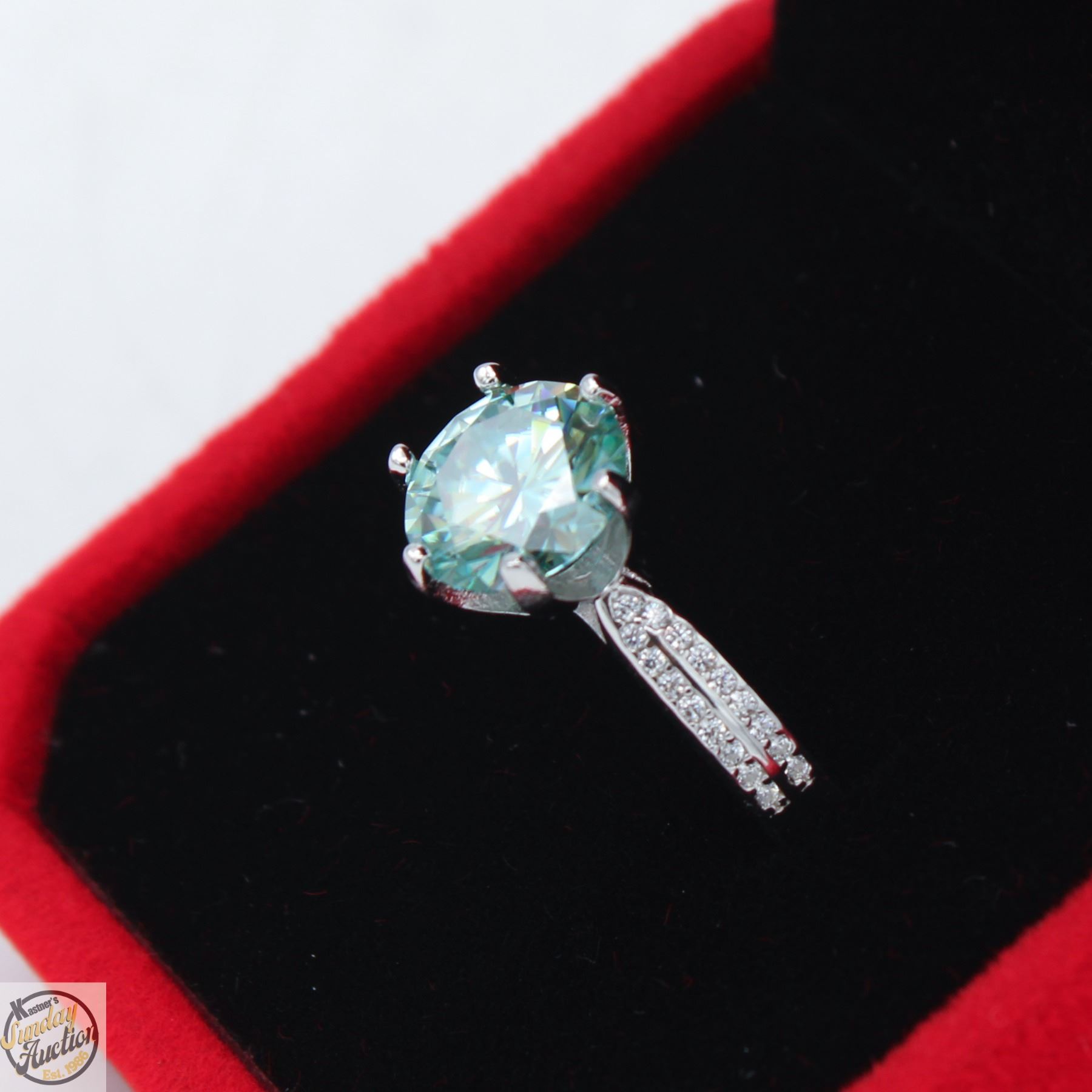 CUT MOISSANITE STONE VVS LIGHT BLUE COLOR SET IN CENTER WITH 34 ROUND BRILLIANT CUT CUBIC ZIRCONIA SET IN DUAL ROWS IN SHANKS AND SET IN 925 SILVER RING SIZE 7 RETAIL VALUE $1,275.00 **ALL ITEMS MUST BE REMOVED BY 5PM SATURDAY, SEPTEMBER 20TH 2025. ALL REMAINING ITEMS WILL BE SUBJECT TO A $6.00 PER DAY STORAGE CHARGE. ANY ITEMS REMAINING AFTER MONDAY, OCTOBER 6TH 2025 WILL BE CONSIDERED FORFEITED. NO REFUNDS WILL BE ISSUED FOR FORFEITED ITEMS. TO SCHEDULE A PICK UP APPOINTMENT CLICK HERE