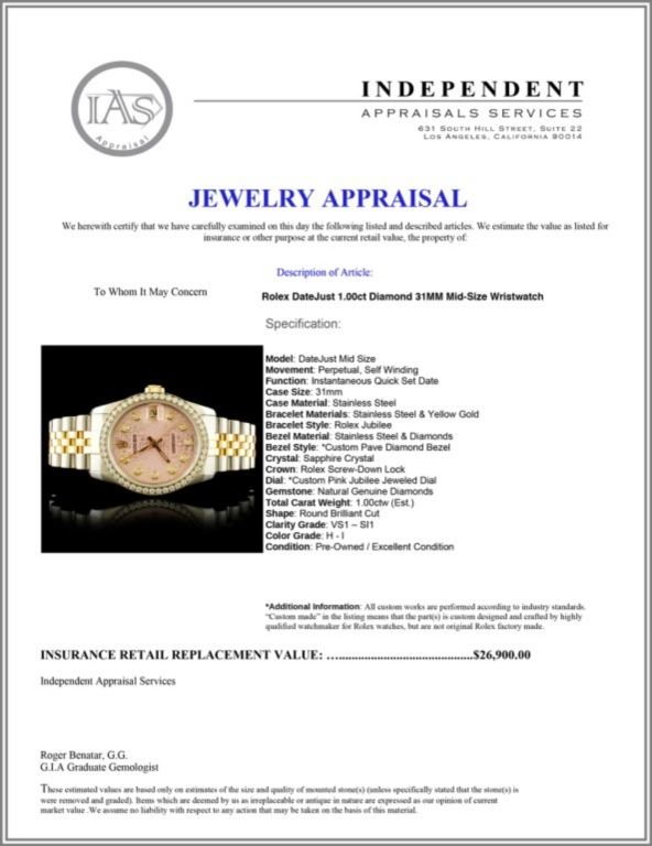 Regarding Appraised Jewelry and Loose Stones - Auctionfarm sends them out to a third party for Retail Replacement Value Appraisals, which are the most common. These types of evaluations are written for insurance needs. This would be the cost to replace the jewelry with an item of equal quality and kind, considered to be the current market price or the replacement value. This type of appraisal is done to protect you in the event of damage or loss of a valuable item. Our appraisals are conducted by independent 3rd Party appraisal firms that utilizes Certified GIA Gemologist. Appraisals should be used for verification of gemstone and/or metal weight, size, and grade only, not actual value. Appraisal value should be considered for insurance purposes only, not actual value, as price varies greatly from retail locations thru out the world. Items should not be purchased with the expectation to resell for appraisal price, or for profit.