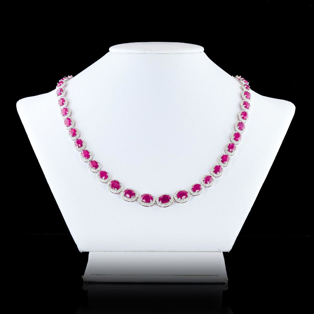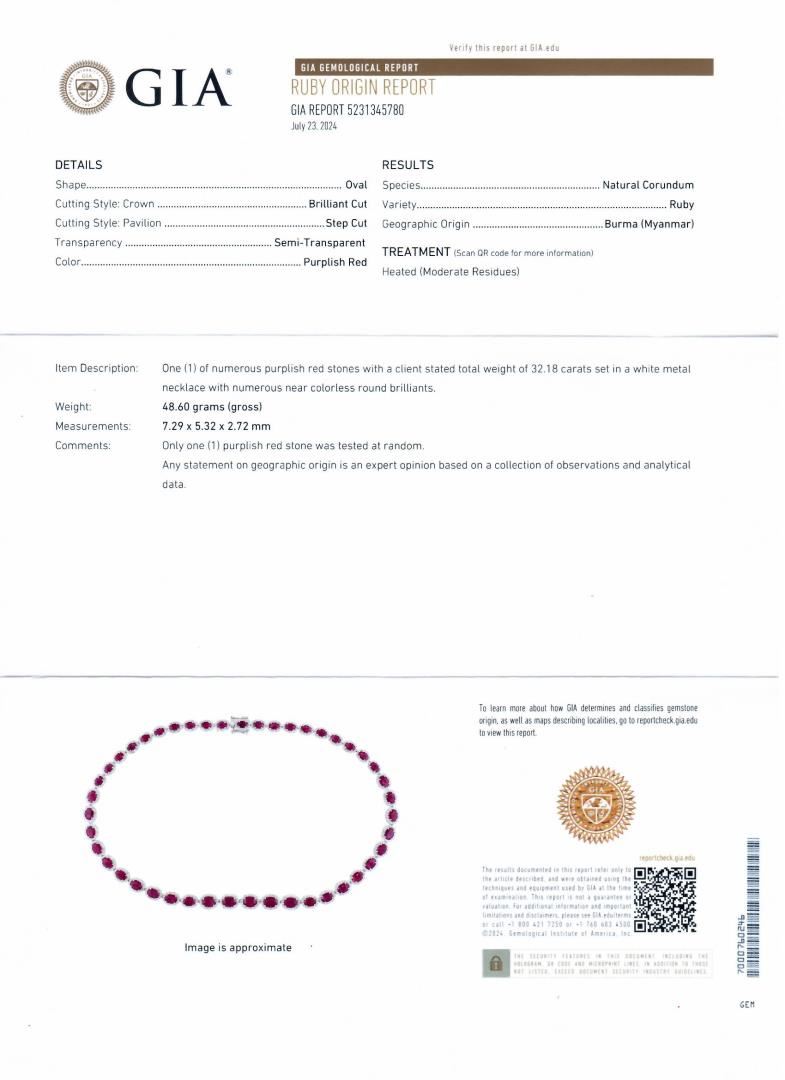 One polished, stamped, and tested platinum necklace marked Aaron Gofflieb Antwerp. The necklace is mounted with: 45 genuine Burmese Rubies weighing approximately 32.18 carats. and 690 genuine round diamonds weighing approximately 7.08 carats. The necklace measures 17.5 inches in length and is finished with a tension lock clasp and double safety clasps. This item weighs 48.6 grams, condition is new, excellent workmanship. #MAIN GEMSTONES# Species: Natural Corundum Variety: Ruby Origin: Burma (Myanmar) Shape: Oval Cutting Style: Brilliant Cut Crown, Step Cut Pavilion Quantity: 45 Rubies Measurements: 6 x 4 - 8 x 6mm Total Weight: 32.18 carats Color: Purplish Red Transparency: Semi Transparent Treatment: Heat with Residues Refractive Index: 1.762 - 1.770 DR Hardness 9 #ADJACENT GEMSTONES ON NECKLACE# Identity: Natural Diamond Shape: Round Quantity: 690 Diamonds Measurements: 1.2 - 1.5mm Total Weight: 7.08 carats Clarity Grade: SI1-I1 Color Grade: G-I Refractive Index: 2.417 Hardness: 10 TOTAL RUBY WEIGHT: 32.18 cts TOTAL DIAMOND WEIGHT: 7.08 cts WEIGHT OF ITEM: 48.6 grams METAL: Platinum Size: 17 1/2