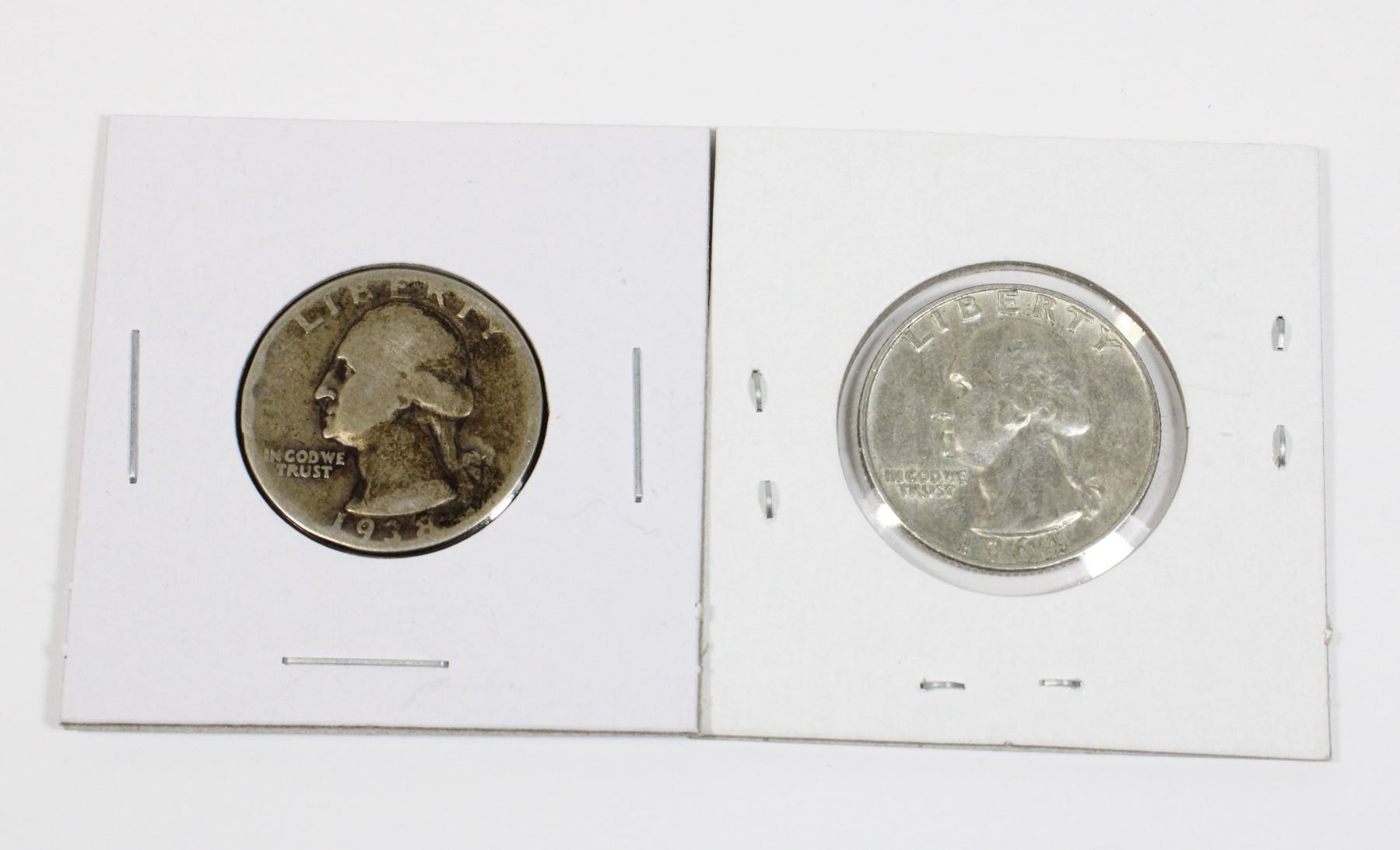 LOT OF 2 SILVER WASHINGTON UNITED STATES SILVER QUARTERS 1938 1964 UNITED STATES OF AMERICA US USA SILVER CURRENCY