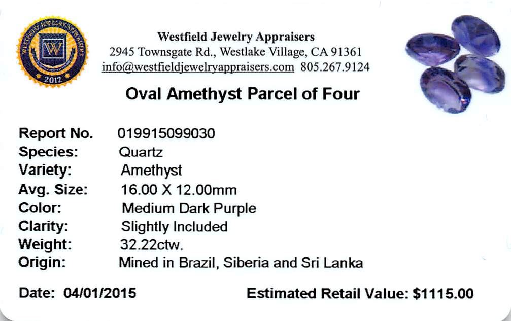 Four oval mixed cut natural amethysts exact total weight 32.22ct., clarity is slightly included, type II, medium dark, very slightly grayish, purple color, (GIA P 6/3), cut is good. Westfield Appraised at $1,115.00.