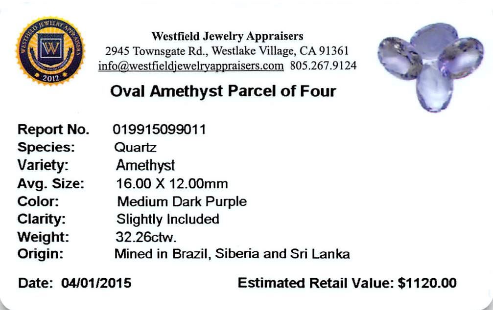 Four oval mixed cut natural amethysts exact total weight 32.26ct., clarity is slightly included, type II, medium dark, very slightly grayish, purple color, (GIA P 6/3), cut is good. Westfield Appraised at $1,120.00.