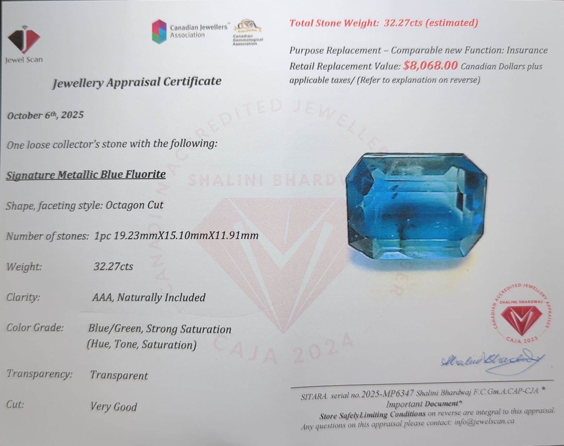 32.27 ct Certified Metallic Blue Fluorite gemstone ($8,068 Appraisal)