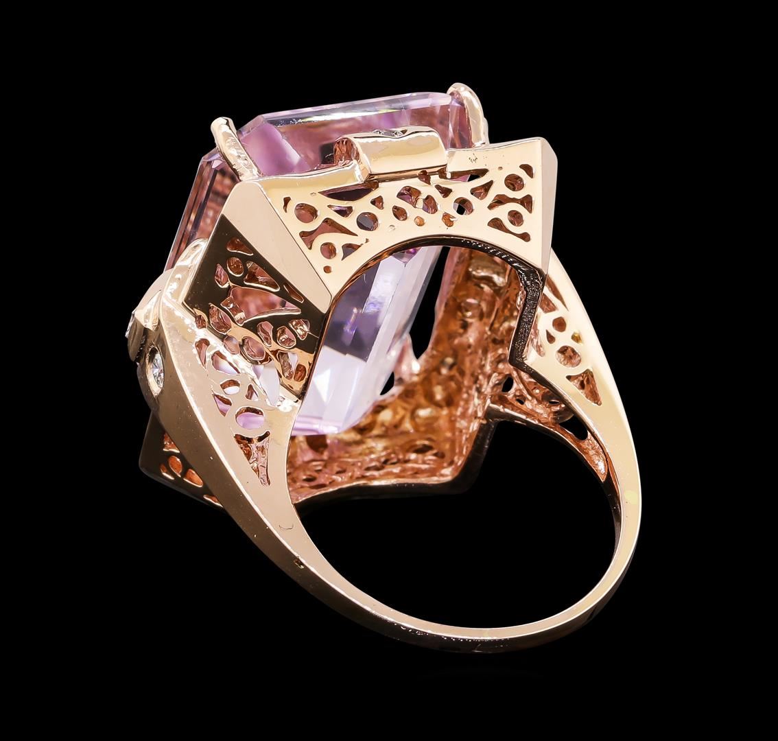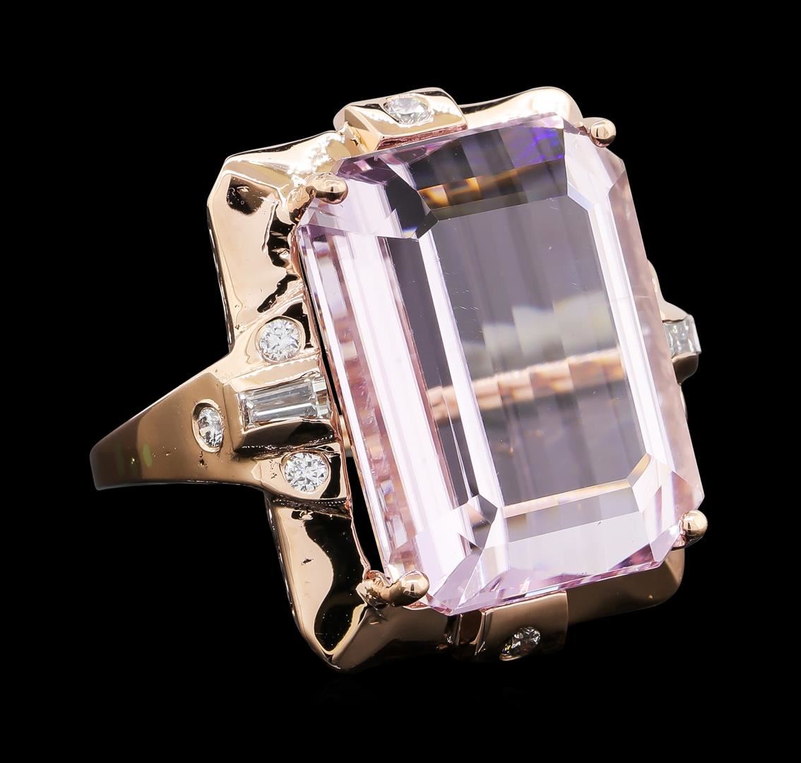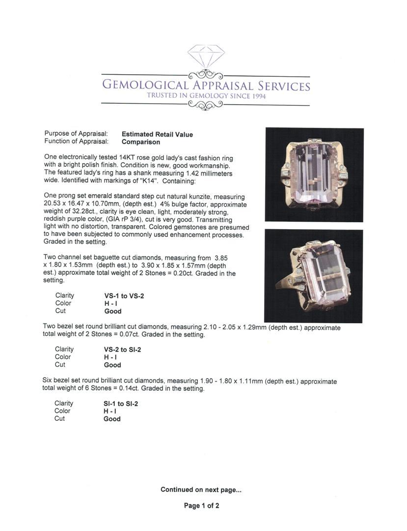 One electronically tested 14KT rose gold lady's cast fashion ring with a bright polish finish. The featured lady's ring has a shank measuring 1.42 millimeters wide. Identified with markings of 'K14'. Condition is new, good workmanship. Containing: One prong set emerald standard step cut natural kunzite, measuring 20.53 x 16.47 x 10.70mm, (depth est.) 4%. bulge factor, approximate weight of 32.28ct., clarity is eye clean, light, moderately strong, reddish purple color, (GIA rP 3/4), cut is very good. Transmitting light with no distortion, transparent. Colored gemstones are presumed to have been subjected to commonly used enhancement processes. Graded in the setting. Two channel set baguette cut diamonds, measuring from 3.85 x 1.80 x 1.53mm (depth est.) to 3.90 x 1.85 x 1.57mm (depth est.) approximate total weight of 2 Stones = 0.20ct. Graded in the setting. Clarity VS-1 to VS-2. Color: H - I Cut Good Two bezel set round brilliant cut diamonds, measuring 2.10 - 2.05 x 1.29mm (depth est.) approximate total weight of 2 Stones = 0.07ct. Graded in the setting. Clarity VS-2 to SI-2. Color: H - I Cut Good Six bezel set round brilliant cut diamonds, measuring 1.90 - 1.80 x 1.11mm (depth est.) approximate total weight of 6 Stones = 0.14ct. Graded in the setting. Clarity SI-1 to SI-2. Color: H - I Cut Good. Total Weight of Colored Stones 32.28ct.. Total Weight of Diamonds 0.41ct.. Total Weight of Ring 16.80gm. GAS Appraised at $12,165.00.