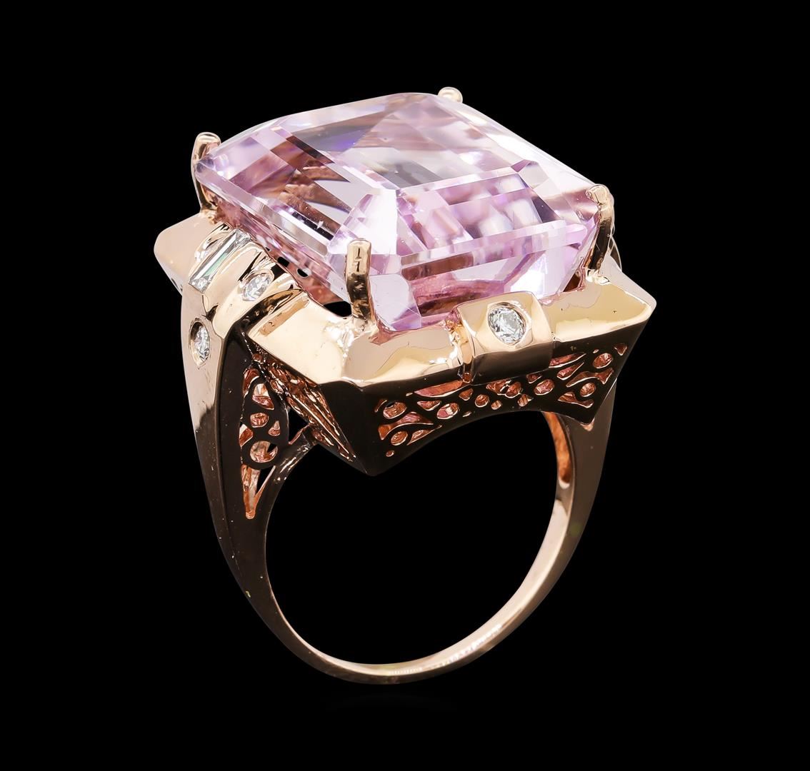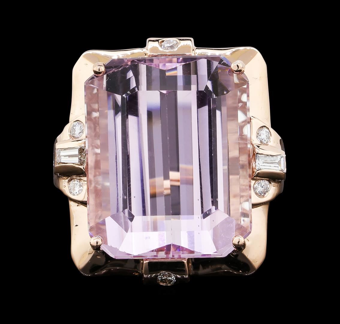 One electronically tested 14KT rose gold lady's cast fashion ring with a bright polish finish. The featured lady's ring has a shank measuring 1.42 millimeters wide. Identified with markings of 'K14'. Condition is new, good workmanship. Containing: One prong set emerald standard step cut natural kunzite, measuring 20.53 x 16.47 x 10.70mm, (depth est.) 4%. bulge factor, approximate weight of 32.28ct., clarity is eye clean, light, moderately strong, reddish purple color, (GIA rP 3/4), cut is very good. Transmitting light with no distortion, transparent. Colored gemstones are presumed to have been subjected to commonly used enhancement processes. Graded in the setting. Two channel set baguette cut diamonds, measuring from 3.85 x 1.80 x 1.53mm (depth est.) to 3.90 x 1.85 x 1.57mm (depth est.) approximate total weight of 2 Stones = 0.20ct. Graded in the setting. Clarity VS-1 to VS-2. Color: H - I Cut Good Two bezel set round brilliant cut diamonds, measuring 2.10 - 2.05 x 1.29mm (depth est.) approximate total weight of 2 Stones = 0.07ct. Graded in the setting. Clarity VS-2 to SI-2. Color: H - I Cut Good Six bezel set round brilliant cut diamonds, measuring 1.90 - 1.80 x 1.11mm (depth est.) approximate total weight of 6 Stones = 0.14ct. Graded in the setting. Clarity SI-1 to SI-2. Color: H - I Cut Good. Total Weight of Colored Stones 32.28ct.. Total Weight of Diamonds 0.41ct.. Total Weight of Ring 16.80gm. GAS Appraised at $12,165.00.