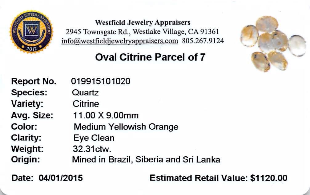 Seven oval mixed cut natural citrine quartzs exact total weight 32.31ct., clarity is eye clean, type I, medium, slightly brownish, yellowish orange color, (GIA yO 5/2), cut is good. Westfield Appraised at $1,120.00.