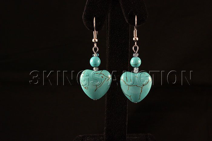 32.37ctw Ladies Heart Turquoise Silver Earring **|**|** 1.5" Heart Shape Turquoise Silver Hook Earring; heart size: 16.40x17.62x7.85mm; round size: 5.91mm ; MSRP: $300