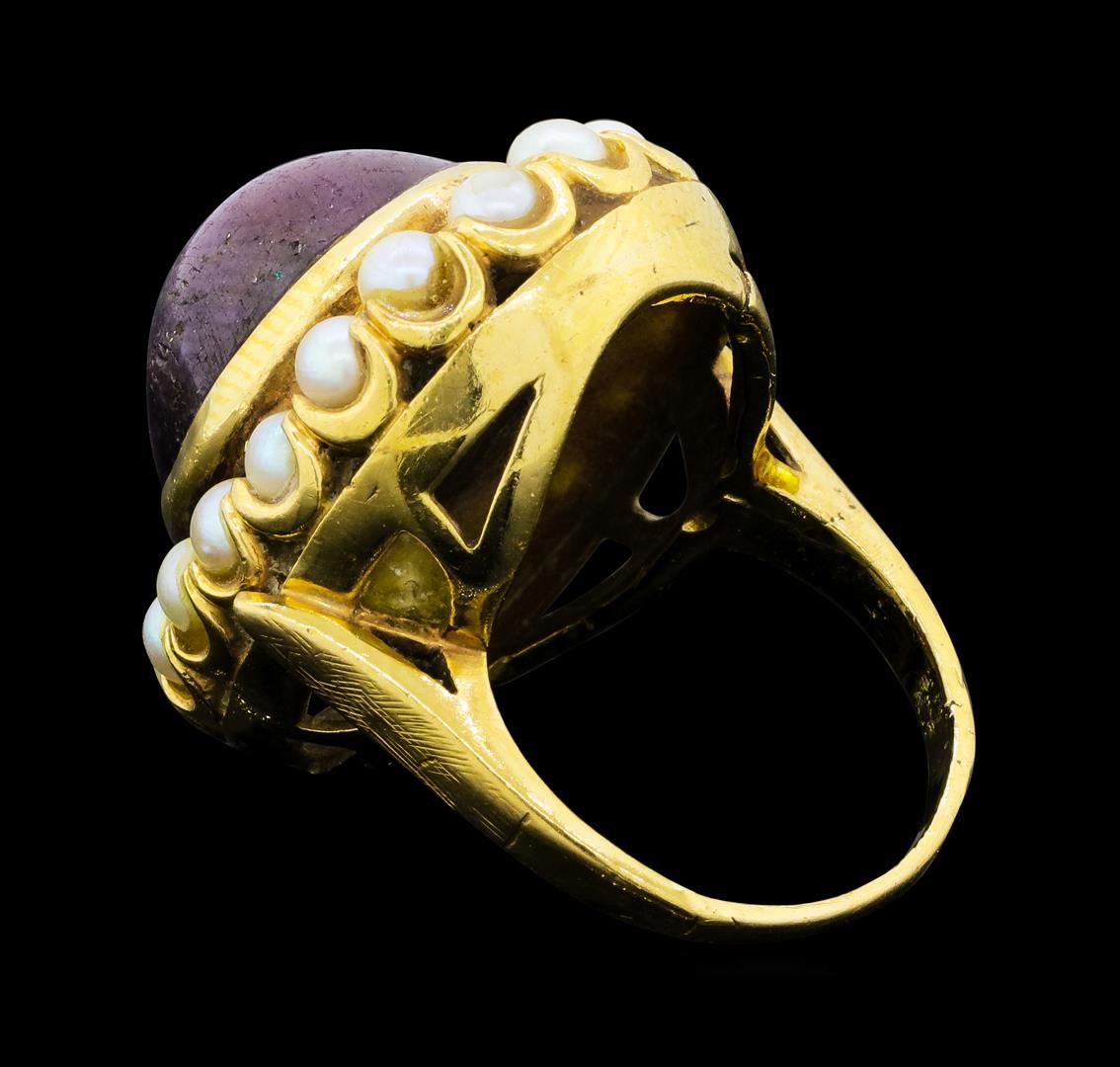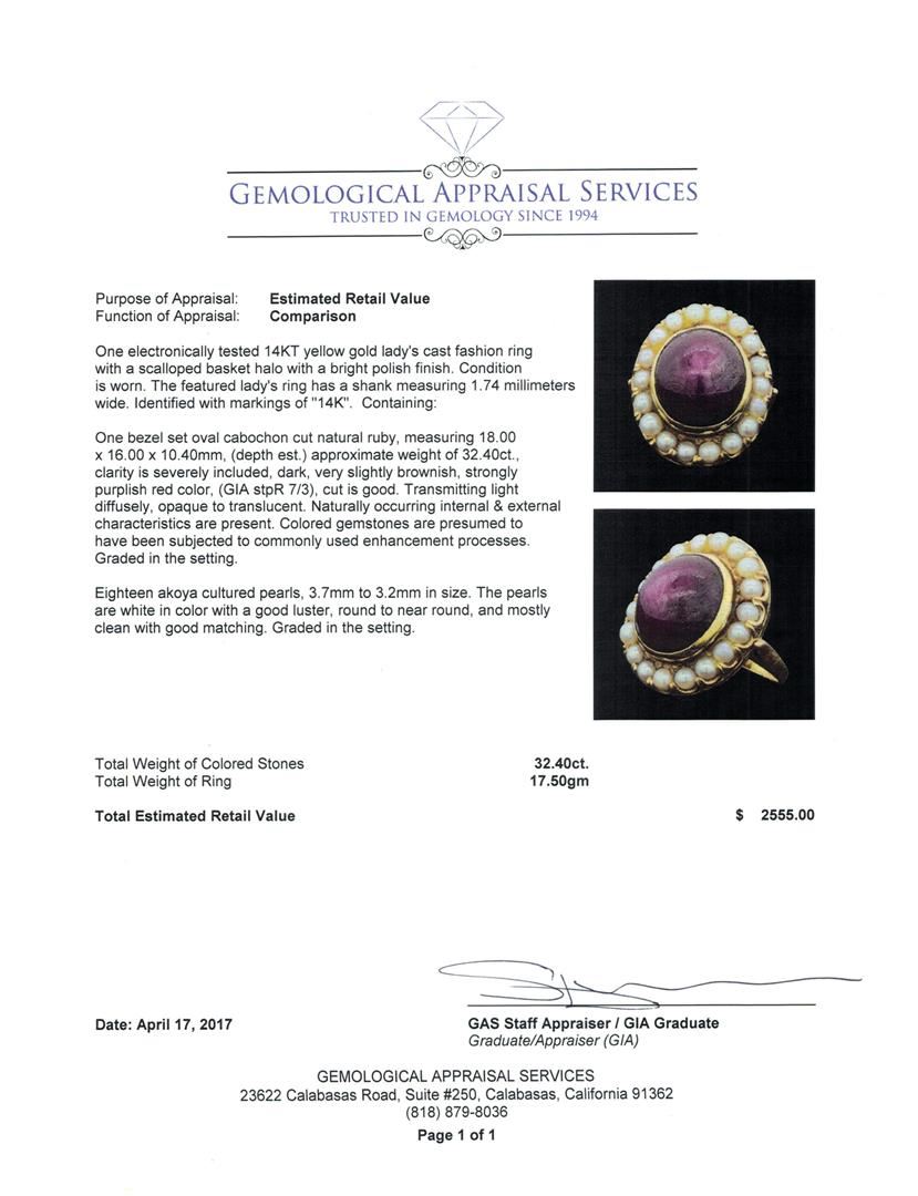 One electronically tested 14KT yellow gold lady's cast fashion ring with a scalloped basket halo with a bright polish finish. The featured lady's ring has a shank measuring 1.74 millimeters wide. Identified with markings of '14K'. Condition is worn. Containing: One bezel set oval cabochon cut natural ruby, measuring 18.00 x 16.00 x 10.40mm, (depth est.) approximate weight of 32.40ct., clarity is severely included, dark, very slightly brownish, strongly purplish red color, (GIA stpR 7/3), cut is good. Transmitting light diffusely, opaque to translucent. Naturally occurring internal & external characteristics are present. Colored gemstones are presumed to have been subjected to commonly used enhancement processes. Graded in the setting. Eighteen akoya cultured pearls, 3.7mm to 3.2mm in size. The pearls are white in color with a good luster, round to near round, and mostly clean with good matching. Graded in the setting.. Total Weight of Colored Stones 32.40ct.. Total Weight of Ring 17.50gm GAS Appraised at $2555.00. GAS Appraised at $15,295.00.