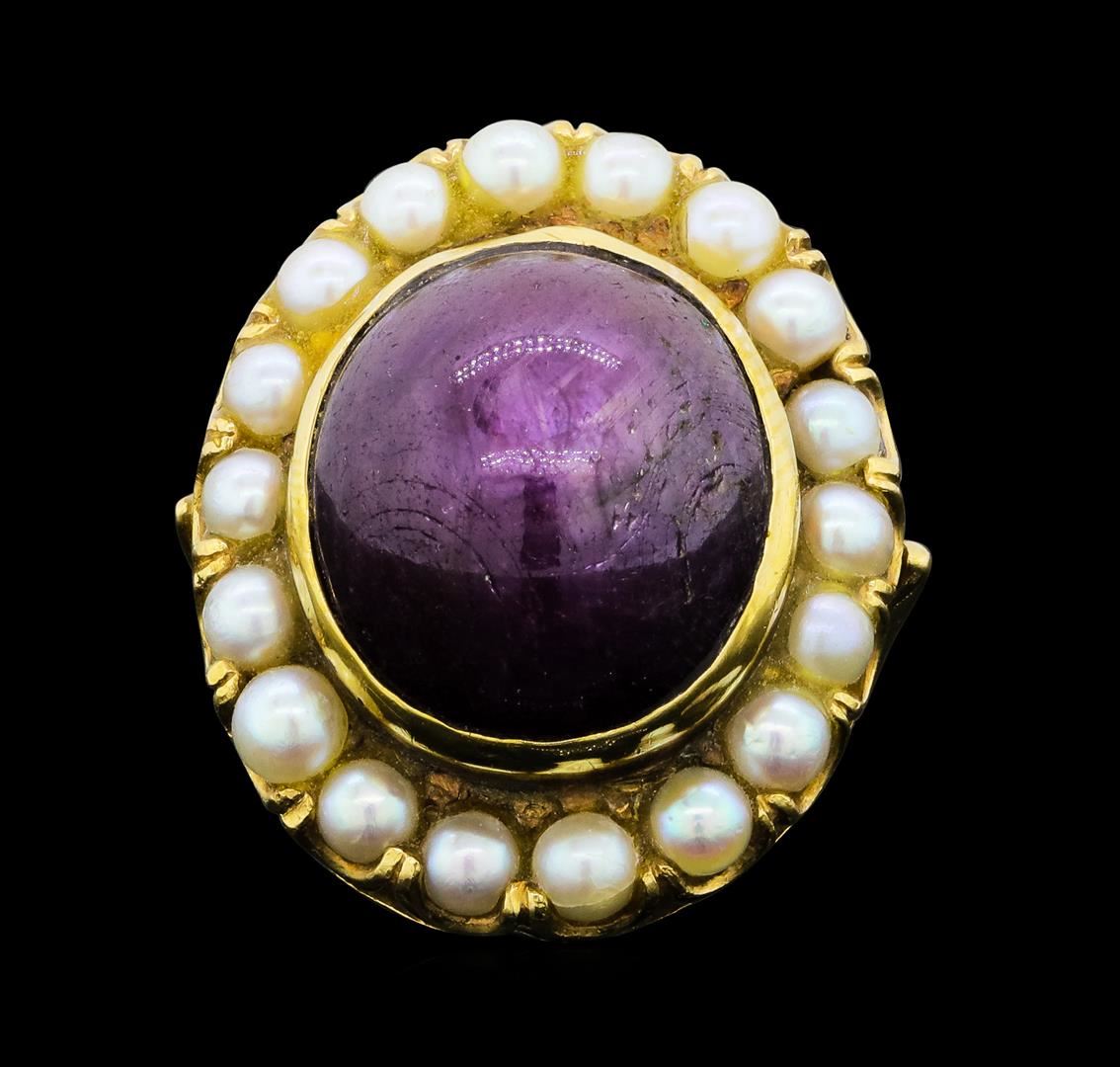 One electronically tested 14KT yellow gold lady's cast fashion ring with a scalloped basket halo with a bright polish finish. The featured lady's ring has a shank measuring 1.74 millimeters wide. Identified with markings of '14K'. Condition is worn. Containing: One bezel set oval cabochon cut natural ruby, measuring 18.00 x 16.00 x 10.40mm, (depth est.) approximate weight of 32.40ct., clarity is severely included, dark, very slightly brownish, strongly purplish red color, (GIA stpR 7/3), cut is good. Transmitting light diffusely, opaque to translucent. Naturally occurring internal & external characteristics are present. Colored gemstones are presumed to have been subjected to commonly used enhancement processes. Graded in the setting. Eighteen akoya cultured pearls, 3.7mm to 3.2mm in size. The pearls are white in color with a good luster, round to near round, and mostly clean with good matching. Graded in the setting.. Total Weight of Colored Stones 32.40ct.. Total Weight of Ring 17.50gm GAS Appraised at $2555.00. GAS Appraised at $15,295.00.