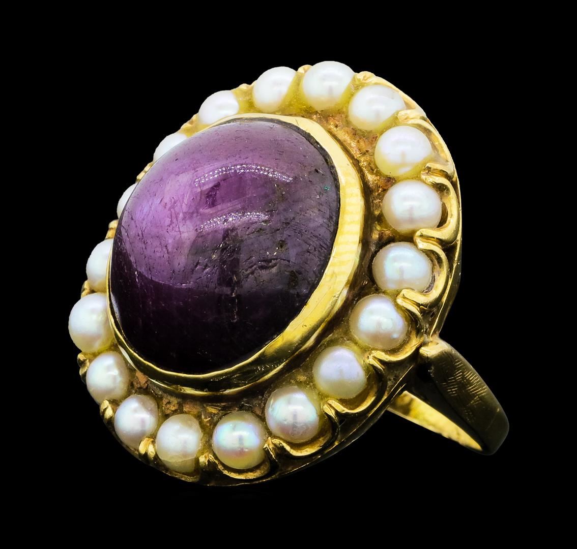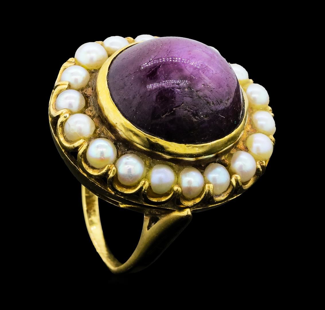 One electronically tested 14KT yellow gold lady's cast fashion ring with a scalloped basket halo with a bright polish finish. The featured lady's ring has a shank measuring 1.74 millimeters wide. Identified with markings of '14K'. Condition is worn. Containing: One bezel set oval cabochon cut natural ruby, measuring 18.00 x 16.00 x 10.40mm, (depth est.) approximate weight of 32.40ct., clarity is severely included, dark, very slightly brownish, strongly purplish red color, (GIA stpR 7/3), cut is good. Transmitting light diffusely, opaque to translucent. Naturally occurring internal & external characteristics are present. Colored gemstones are presumed to have been subjected to commonly used enhancement processes. Graded in the setting. Eighteen akoya cultured pearls, 3.7mm to 3.2mm in size. The pearls are white in color with a good luster, round to near round, and mostly clean with good matching. Graded in the setting.. Total Weight of Colored Stones 32.40ct.. Total Weight of Ring 17.50gm GAS Appraised at $2555.00. GAS Appraised at $15,295.00.