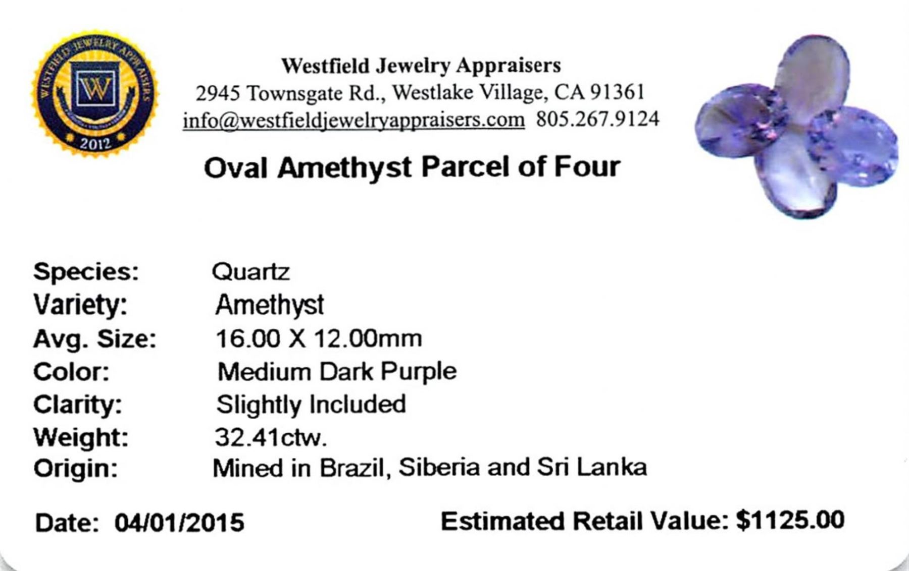 Four oval mixed cut natural amethysts exact total weight 32.41ct., clarity is slightly included, type II, medium dark, very slightly grayish, purple color, (GIA P 6/3), cut is good. Westfield Appraised.