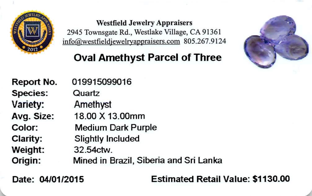 Three oval mixed cut natural ametrine quartzs exact total weight 32.54ct., clarity is slightly included, type I, medium dark, very slightly grayish, purple color, (GIA P 6/3), cut is good. Westfield Appraised at $1,130.00.