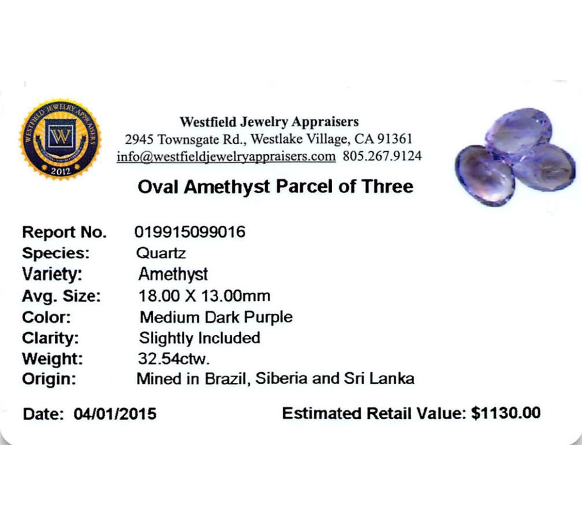Three oval mixed cut natural ametrine quartzs exact total weight 32.54ct., clarity is slightly included, type I, medium dark, very slightly grayish, purple color, (GIA P 6/3), cut is good. Westfield Appraised at $1,130.00.