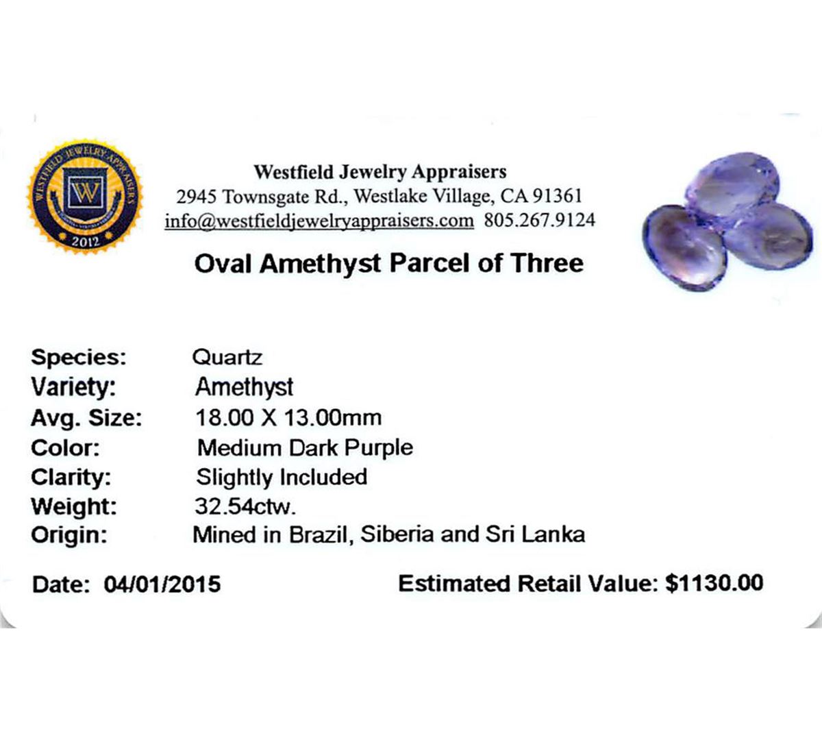 Three oval mixed cut natural ametrine quartzs exact total weight 32.54ct., clarity is slightly included, type I, medium dark, very slightly grayish, purple color, (GIA P 6/3), cut is good. Westfield Appraised at $1,130.00.