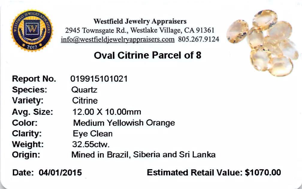 Eight oval mixed cut natural citrine quartzs exact total weight 32.55ct., clarity is eye clean, type I, medium dark, brownish, yellowish orange color, (GIA yO 6/3), cut is good. Westfield Appraised at $1,070.00.