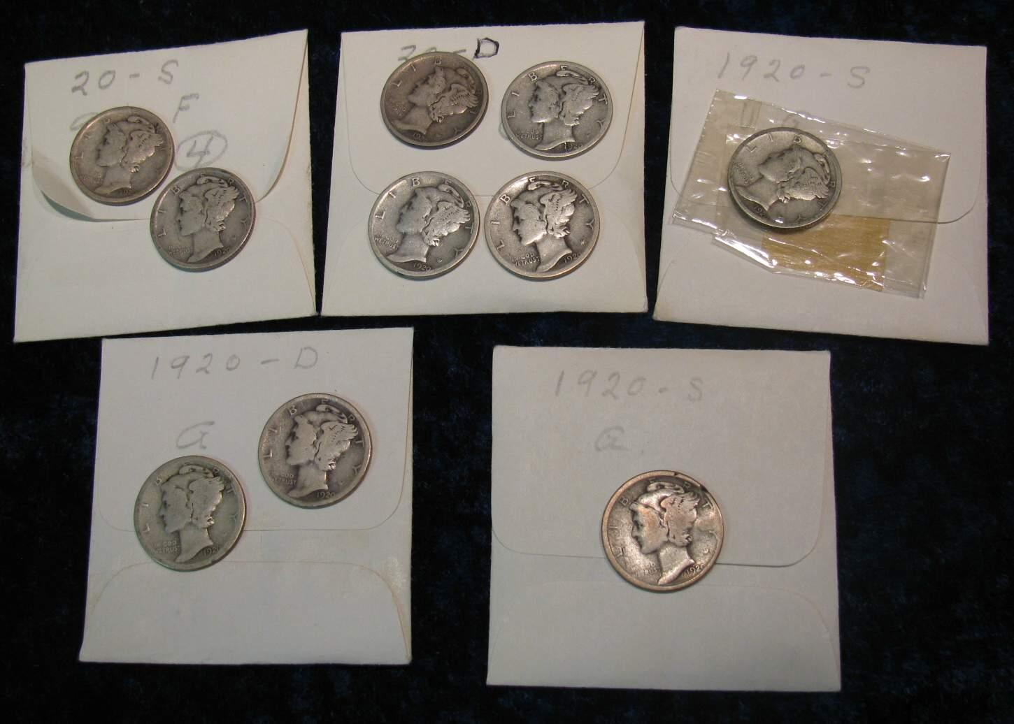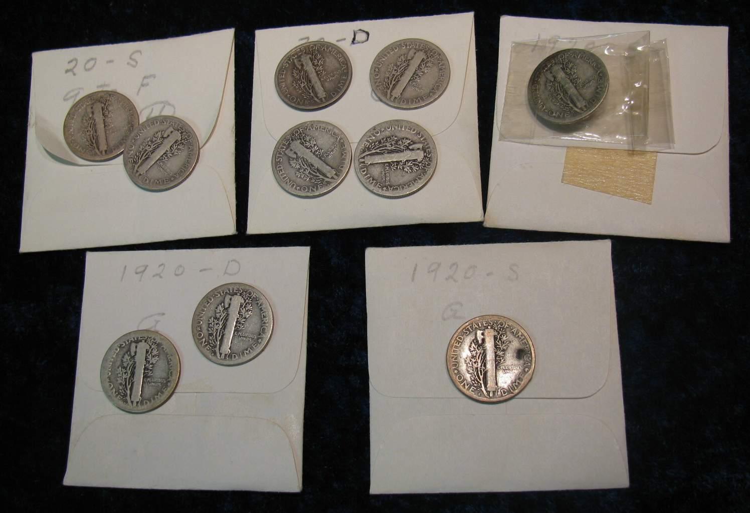 32. (6) 1920D & (4) S Mercury Dimes. AG-VG. RB approx $30