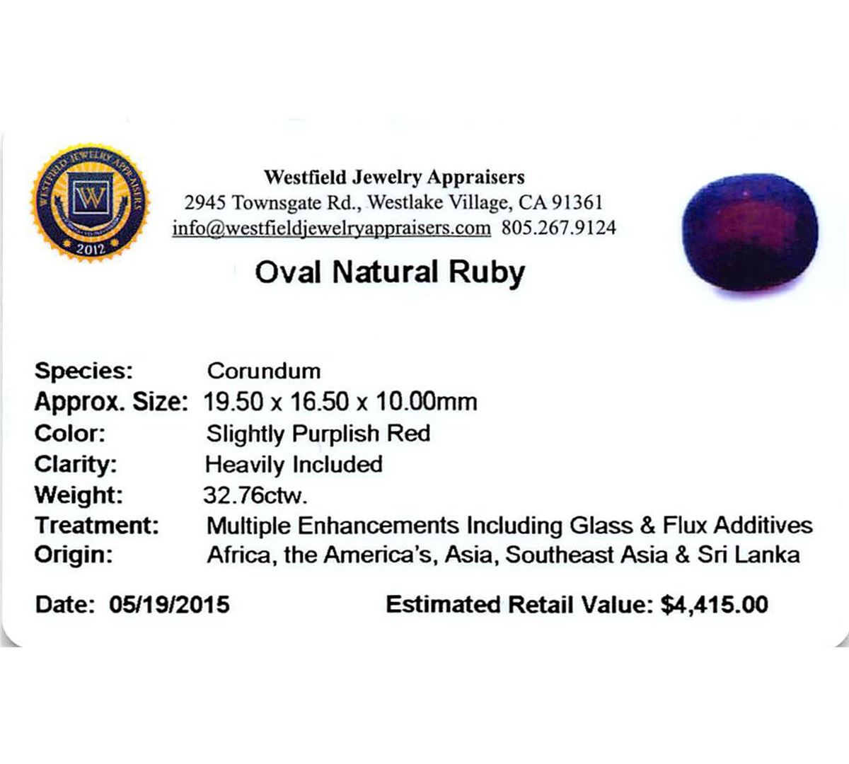One oval mixed cut natural ruby, measuring 19.50 x 16.50 x 10.00mm, exact weight 32.76ct., clarity is heavily included, type II, dark, very slightly brownish, slightly purplish red color, (GIA slpR 7/3), cut is good. Transmitting light somewhat diffusely, transparent to translucent. Naturally occurring internal & external characteristics are present. Indications of laboratory high temperature heat treatment, with glass & flux additives. Ruby has a low tolerance to rhodium plating, repolishing the surface, & ultrasonic cleaning. Westfield Appraised at $4,415.00.