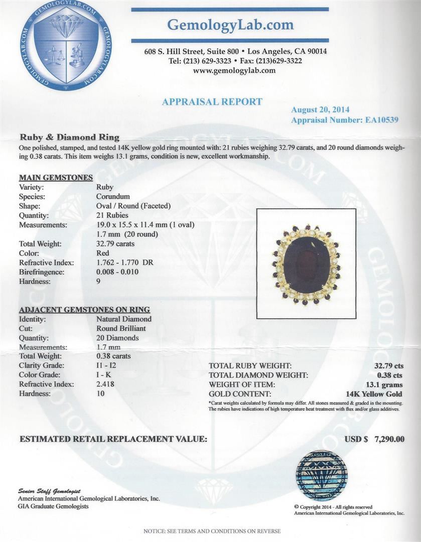One polished, stamped, and tested 14K yellow gold ring mounted with: 21 rubies weighing 32.79ct, and 20 round diamonds weighing 0.38ct. This item weighs 13.10 grams, condition is new, excellent workmanship. Main Gemstone: Variety: Ruby. Species: Corundum. Shape: Oval/round (faceted). Quantity: 21 rubies. Measurements: 19.00 x 15.50 x 11.4mm (1 oval); 1.70mm (20 round). Total Weight: 32.79ct. Color: Red. Refractive Index: 1.762-1.770 DR. Birefringence: 0.008-0.010. Hardness: 9. Adjacent Gemstones on Ring: Identity: Natural diamond. Cut: Round brilliant. Quantity: 20 diamonds. Measurements: 1.70mm. Total Weight: 0.38ct. Clarity Grade: I1-I2. Color Grade: I-K. Refractive Index: 2.418. Hardness: 10. Total ruby weight: 32.79ct. Total diamond weight: 0.38ct. Weight of item: 13.10 grams. AIGL Appraised at $7,290.00.