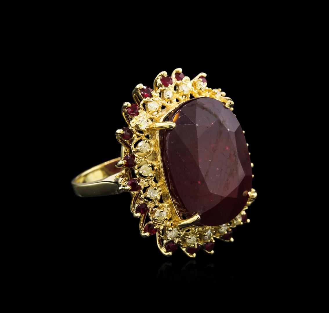 One polished, stamped, and tested 14K yellow gold ring mounted with: 21 rubies weighing 32.79ct, and 20 round diamonds weighing 0.38ct. This item weighs 13.10 grams, condition is new, excellent workmanship. Main Gemstone: Variety: Ruby. Species: Corundum. Shape: Oval/round (faceted). Quantity: 21 rubies. Measurements: 19.00 x 15.50 x 11.4mm (1 oval); 1.70mm (20 round). Total Weight: 32.79ct. Color: Red. Refractive Index: 1.762-1.770 DR. Birefringence: 0.008-0.010. Hardness: 9. Adjacent Gemstones on Ring: Identity: Natural diamond. Cut: Round brilliant. Quantity: 20 diamonds. Measurements: 1.70mm. Total Weight: 0.38ct. Clarity Grade: I1-I2. Color Grade: I-K. Refractive Index: 2.418. Hardness: 10. Total ruby weight: 32.79ct. Total diamond weight: 0.38ct. Weight of item: 13.10 grams. AIGL Appraised at $7,290.00.