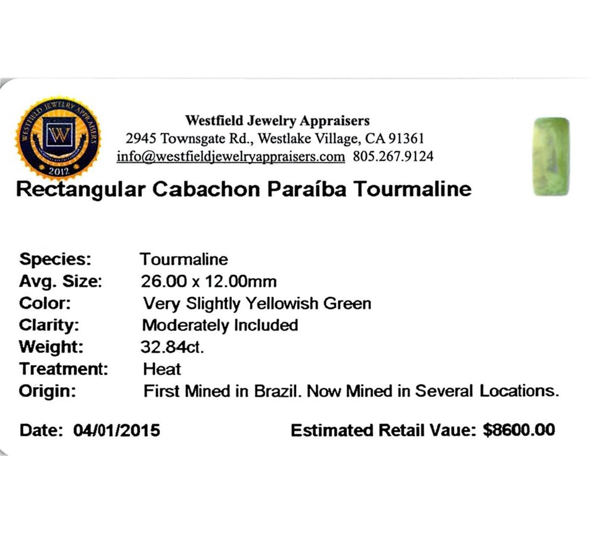 One rectangular cabochon cut natural Paraiba tourmaline exact weight 32.84ct., clarity is moderately included, cut is good. Westfield Appraised at $8,600.00.