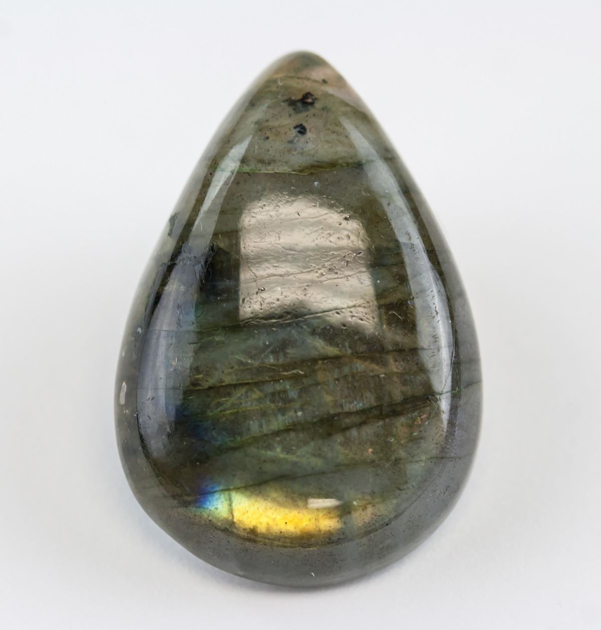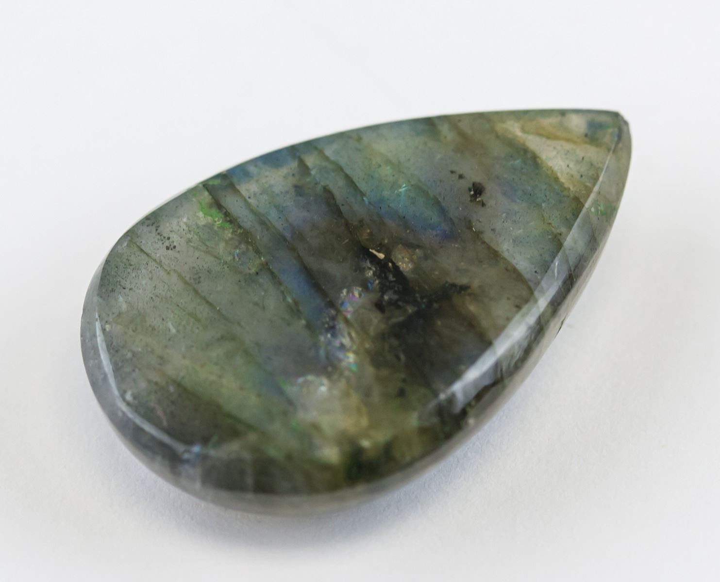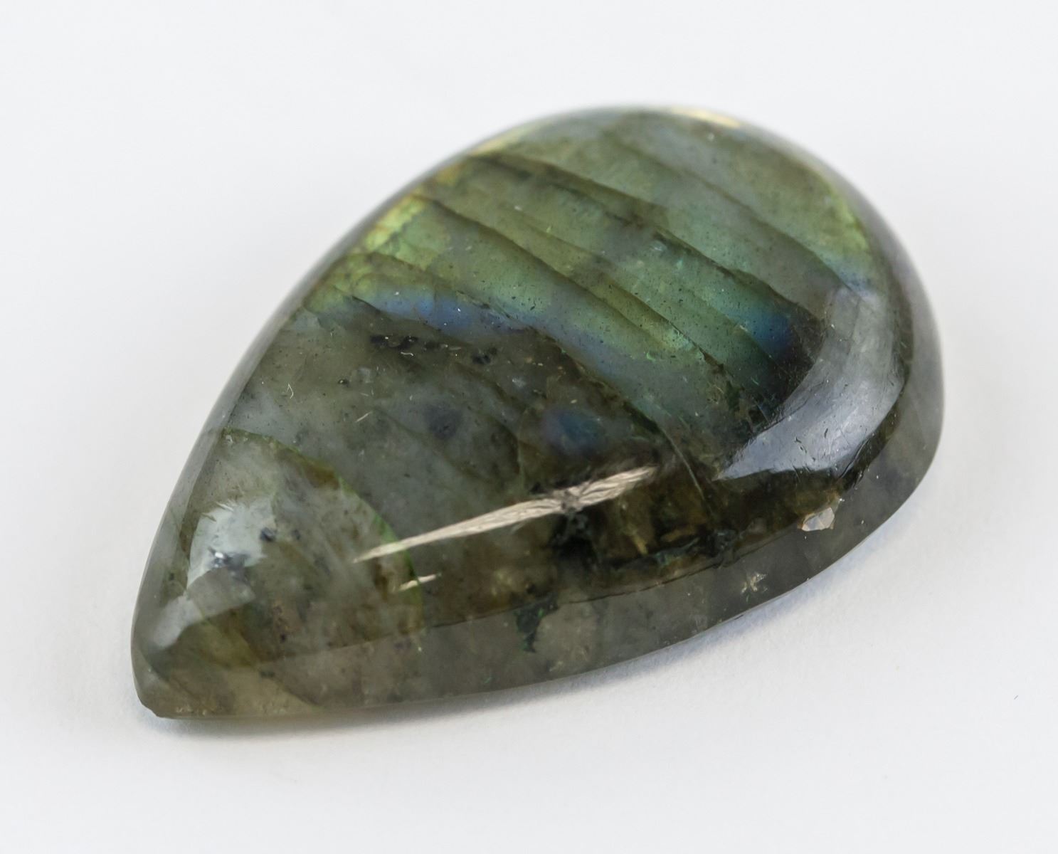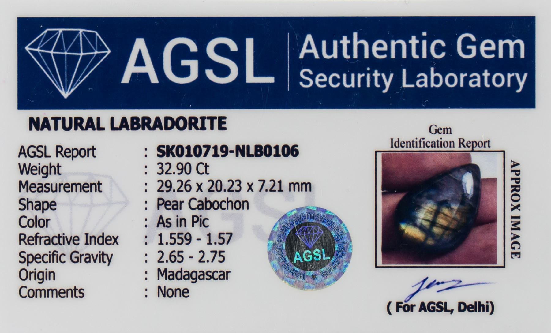One (1) 32.90 ct pear cabochon shape natural labradorite gemstone. 29.26 x 20.23 x 7.21 mm. Origin: Madagascar. Accompanied with AGSL certificate.