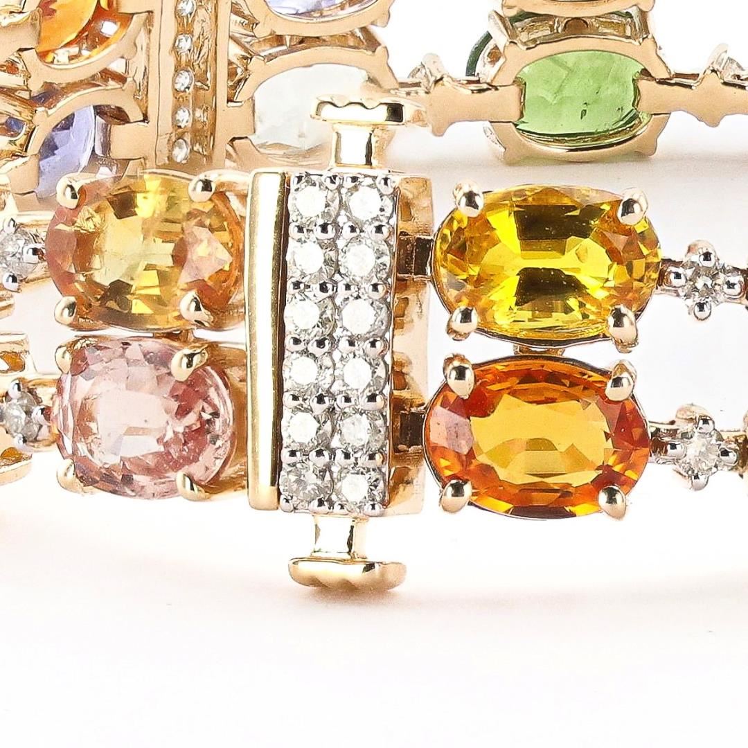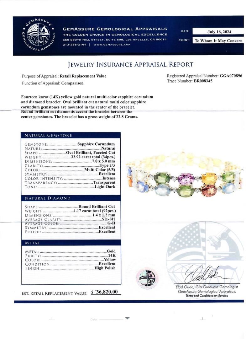 Fourteen karat (14K) yellow gold natural multi color sapphire corundum and diamond bracelet. Oval brilliant cut natural multi color sapphire corundum gemstones are mounted in the center of the bracelet. Round brilliant cut diamonds accent the bracelet between the center gemstones. The bracelet has a gross weight of 22.8 Grams. Brand: Oscar Friedman #NATURAL GEMSTONE# GEMSTONE: Sapphire Corundum NATURE: Natural SHAPE: Oval Brilliant, Faceted Cut WEIGHT: 32.92 carat total (34pcs.) DIMENSIONS: 7.0 x 5.0mm CLARITY: Type 2/3 COLOR: Multi Color (5/5) SYMMETRY: Excellent COLOR INTENSITY: Intense TRANSPARENCY: Transparent TONE: Light-Dark #NATURAL DIAMOND# SHAPE: Round Brilliant Cut WEIGHT: 1.17 carat total (92pcs.) DIMENSIONS: 1.4 x 1.2mm AVERAGE CLARITY: SI1-SI2 AVERAGE COLOR: G-H SYMMETRY: Excellent POLISH: Excellent #METAL# METAL: Gold PURITY: 14K COLOR: Yellow CONDITION: Excellent FINISH: High Polish Size: 7