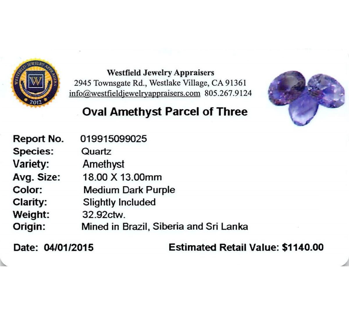 Three oval mixed cut natural amethysts exact total weight 32.92ct., clarity is slightly included, type II, medium dark, very slightly grayish, purple color, (GIA P 6/3), cut is good. Westfield Appraised at $1,140.00.