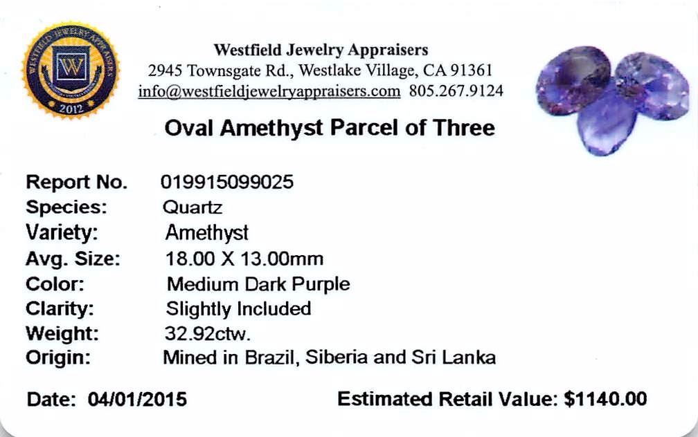 Three oval mixed cut natural amethysts exact total weight 32.92ct., clarity is slightly included, type II, medium dark, very slightly grayish, purple color, (GIA P 6/3), cut is good. Westfield Appraised at $1,140.00.