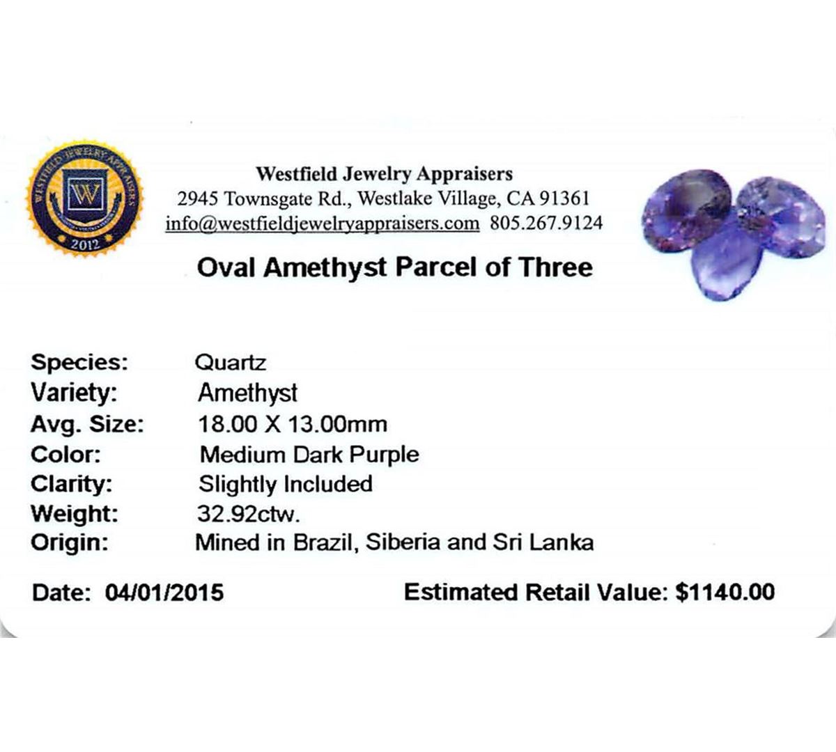 Three oval mixed cut natural amethysts exact total weight 32.92ct., clarity is slightly included, type II, medium dark, very slightly grayish, purple color, (GIA P 6/3), cut is good. Westfield Appraised at $1,140.00.
