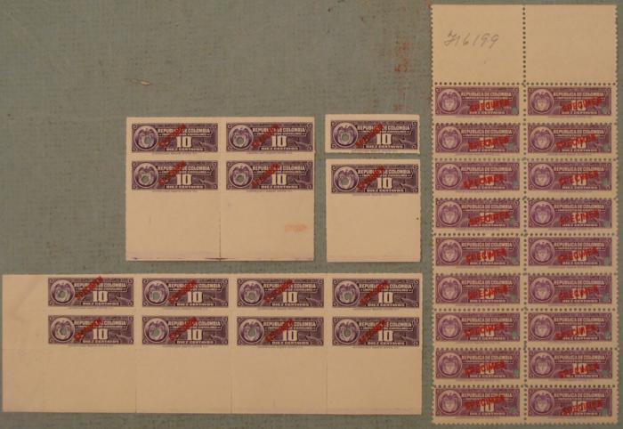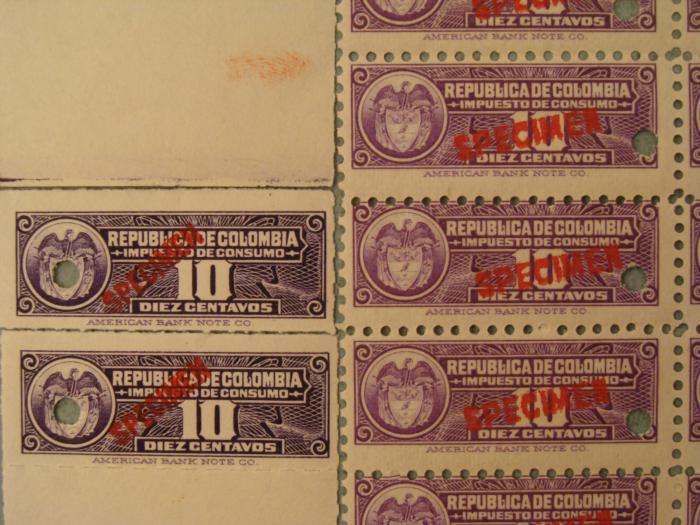Here are 4 separate sections of plate blocks containing (32) small size 10 Centavos Revenue Stamps from Republic De Colombia, marked "IMPUESTO DE CONSUMO." Each has a red "SPECIMEN" overprint and security punch. They are marked "American Bank Note Co." There is slight variation in color, with some being darker. They are gummed and unused, in very good condition, with some separatation at the perforations.