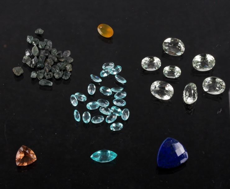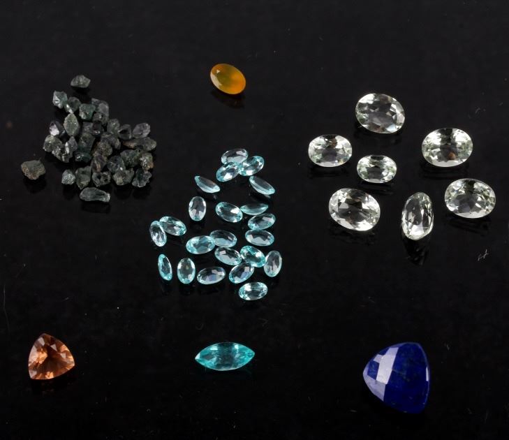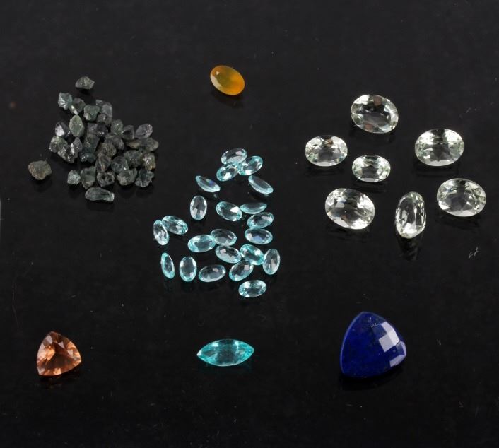 For your consideration is a 32 carat collection of various loose and precious gemstones. This collection includes Lapis Lazuli, Fluorite, Alexandrite, Apatite, Andesine and Prasiolite. All these gemstones are expertly cut with various styles including trillion, oval, marquise, and a rough cut alexandrite. The lapis lazuli shows a deep blue, trillion cut measuring approximately 12x12x7.14mm, and comes in a protective case. There are 22 Apatite gemstones in an oval cut, measuring approximately 5x3mm. These gems show a beautifully light blue and are in good condition. There is a Apatite stone with a marquise cut, and shows a beautiful blue color. This gemstone is in good condition and measures approximately 10.10x4.93x3.29mm. Included in this lot is a Fluorite gem with an oval cut, and is has a light orange color. This gemstone measures approximately 5.06x7.01x3.59mm. Also in this collection are 32 rough cut Alexandrite gemstones with a deep green color. These rough cut stones measure approximately 2mm to 3mm. There is an Andesine color change stone, cut into a trillion shape, and has a vibrant green color. This stone measures approximately 7.87x7.95x4.81mm. Finally included in this lot are seven Praziolite gemstones cut into an oval shape. These gemstones are in good condition showing a light green color and measure approximately 9.04x7.13x4.77; 9.02x7.03x3.70; 9.07x7.03x5.63; 9.20x7.05x4.89; 9.11x7.04x4.92; 7.85x6.03x4.09; 7.03x5.07x3.52.
