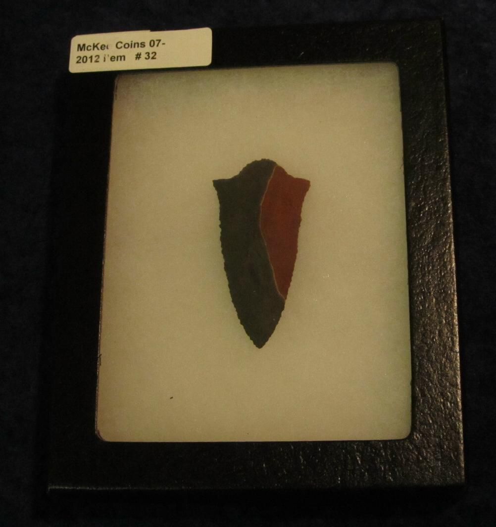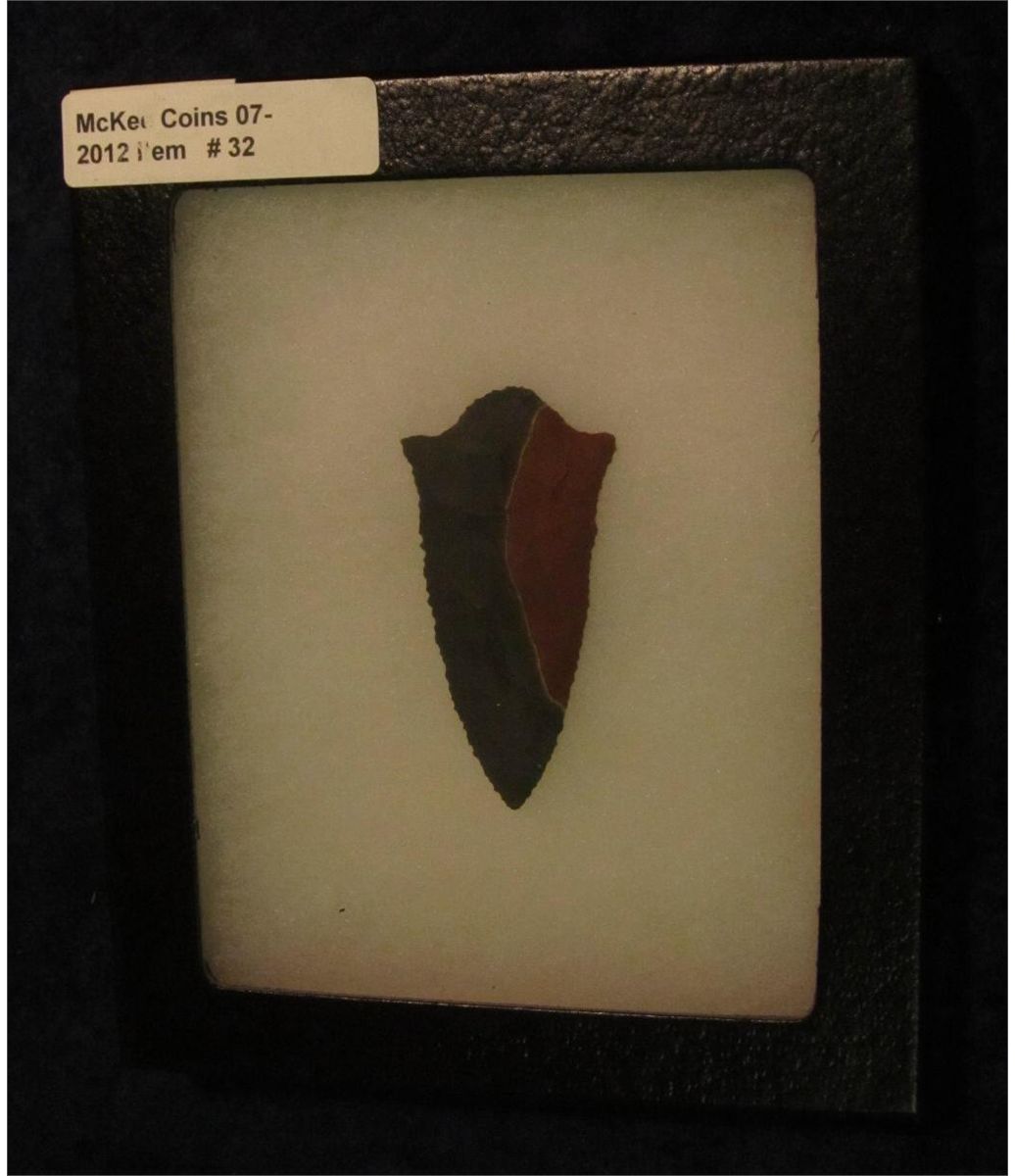 32. Flint Knappers Special. 2 1/4" Serrated Spear Point in extremely bi-colored Chert. Displayed in a glass faced show case.