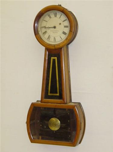32" HOWARD & DAVIS MAHOGANY CASED BANJO CLOCK (BOSTON)-REVERSE PAINTED ON GLASS ON THROAT, FACE SIGNED HOWARD & DAVIS ON BOTTOM - REPLACED GLASS TABLET ON BOTTOM, WEAR & IMPERFECTIONS