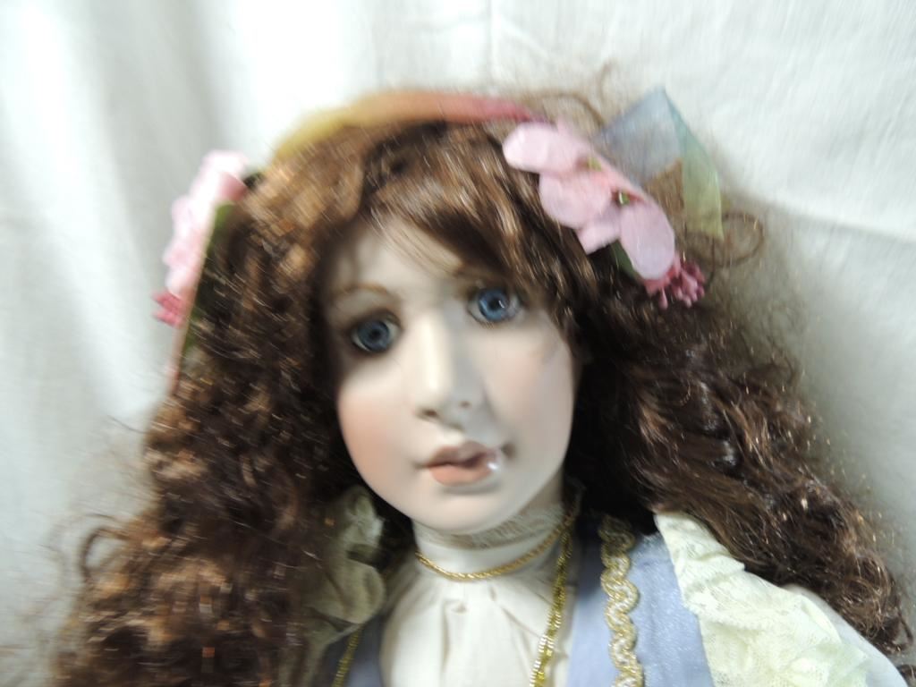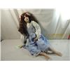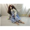 RETIRED DOLL, PARADISE GALLERY DOLLS, DARK CURLY HAIR, BLUE EYES, BLUE DRESS, SEATED DOLL, DECORATIVE DOLL. PORCELAIN DOLL, AS SHOWN SEE PHOTO FOR MORE DETAILS.