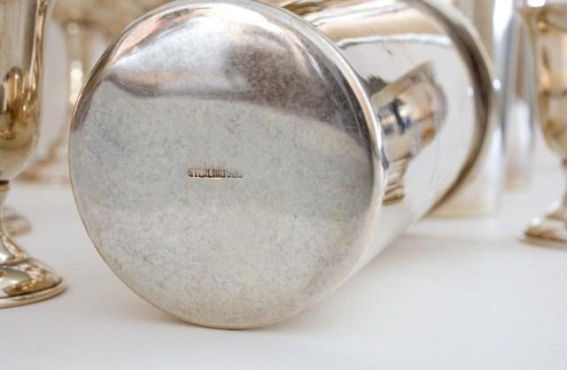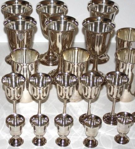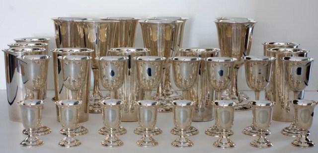 Set includes 32 pieces. 8 Water goblets 6 5/8" height. 8 Cups 4 7/8" height. 8 Wine 4 3/4" height. 8 Small saki 2 5/8" height. Each piece marked 950.
