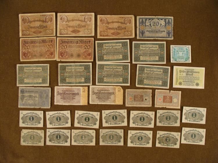 HERE IS A 32 PIECES OF PRE-WWII GERMAN CURRENCY MARK NOTES OF VARIOUS DENOMINATIONS. *