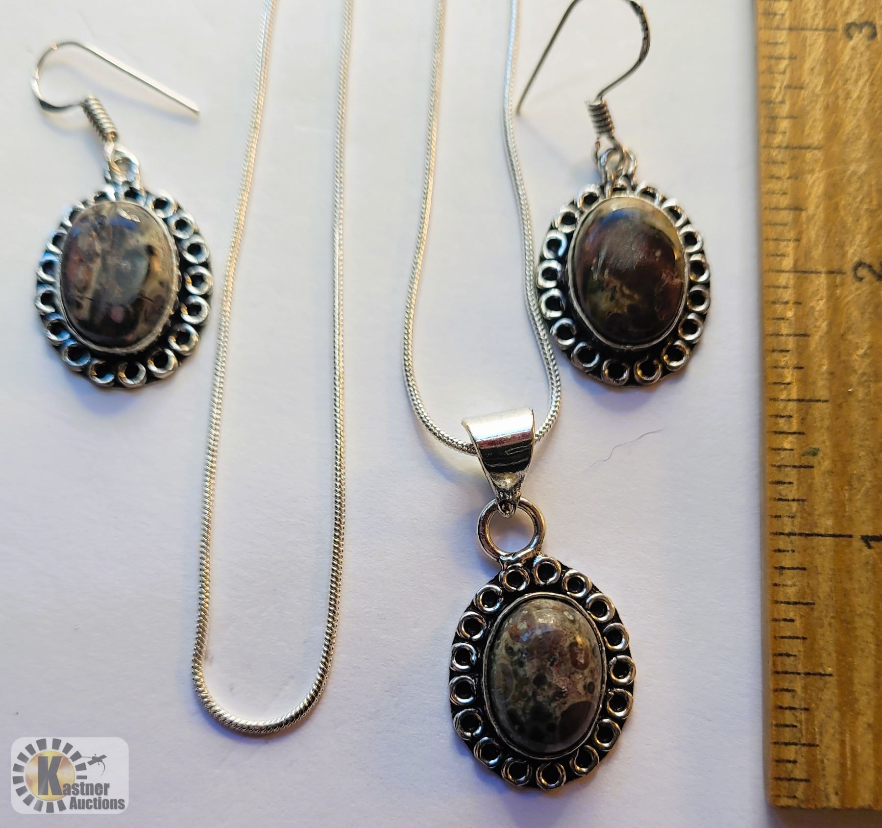 DROP EARRINGS & MATCHING PENDANT ON 20" SNAKE CHAIN, ALL PIECES ARE STAMPED 925 SILVER PLATE. JEWELLERY