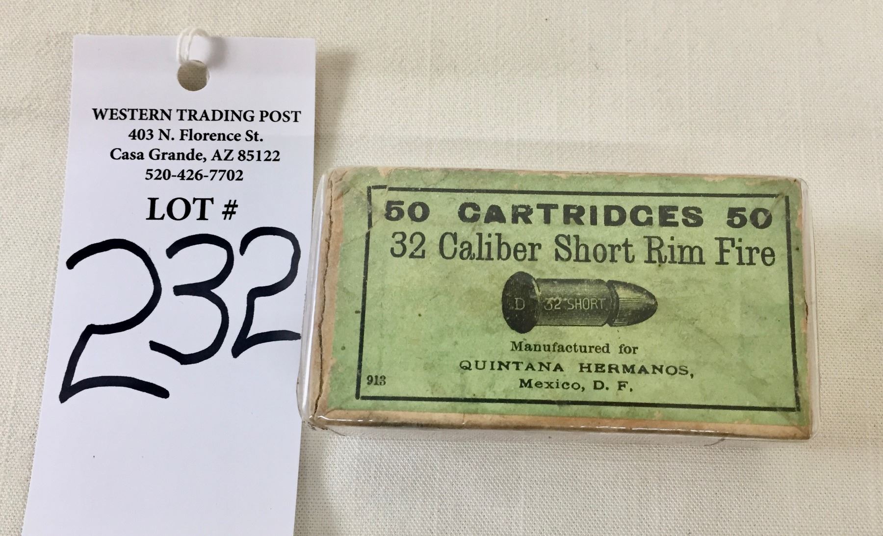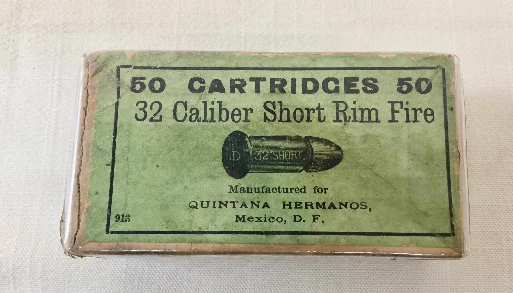 Description: Included for sale in this lot is a collectible box of .32 caliber short rim fire ammo in its original packaging. Maker: Quintana Hermanos, Mexico, D. F.