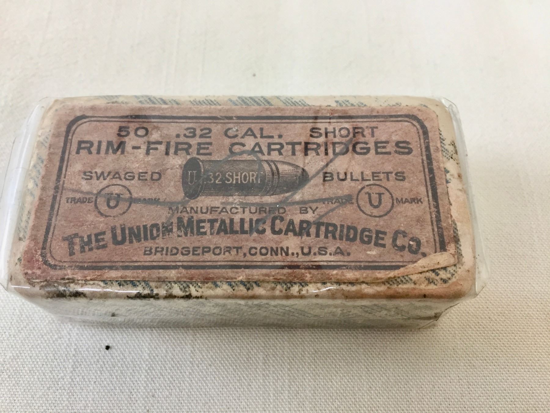 Description: For sale in this lot is a collectible box of .32 caliber short rim fire cartridges in its original packaging. Maker: The Union Metallic Cartridge Co., Bridgeport, Conn. Approx. Age: Vintage.