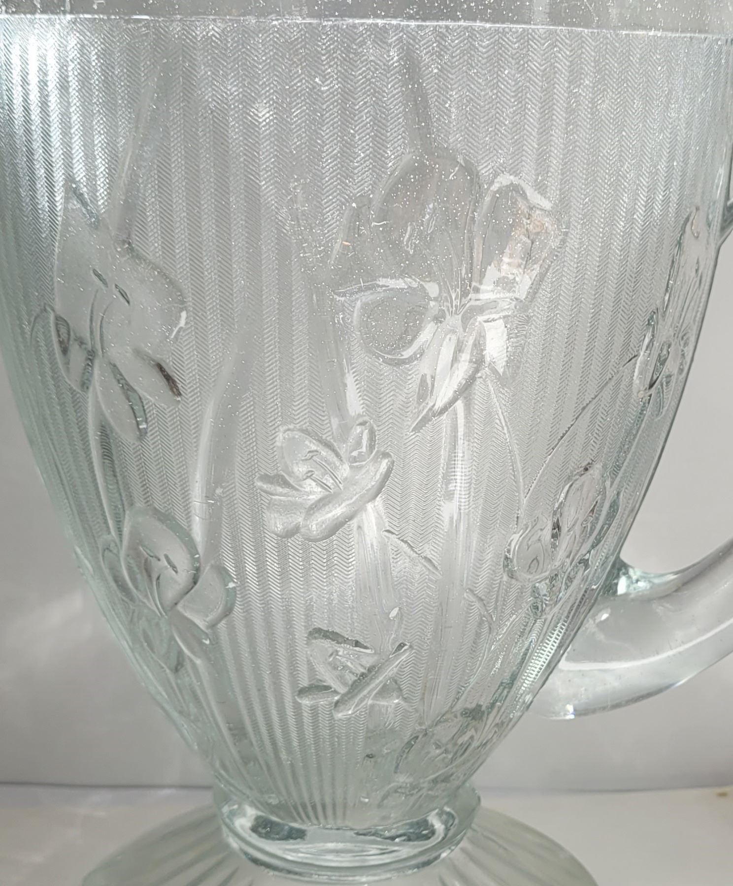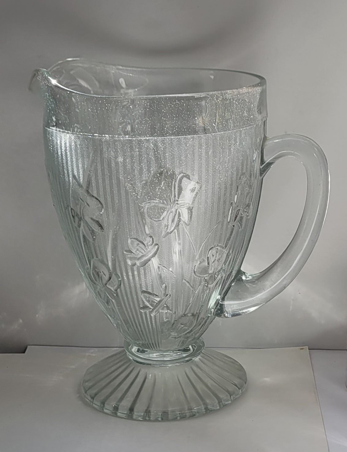 32) VINTAGE, DEPRESSION ERA GLASS PITCHER WITH AN