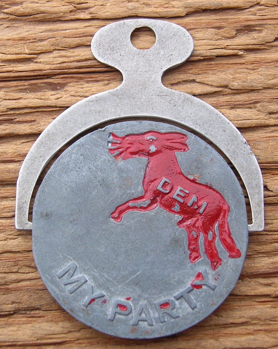 One side shows a red (should be blue) painted donkey whining & babbling & bahhing away on his back feet, with DEM across his body and MY PARTY under.