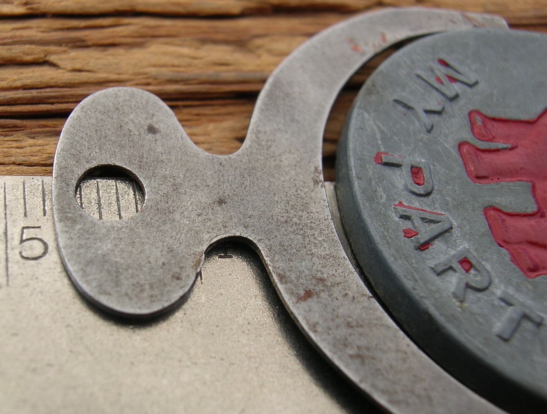 Handle is steel and round spinner appears to be made of zinc. Measures 49mm front end of handle to outside far rim of spinner portion.