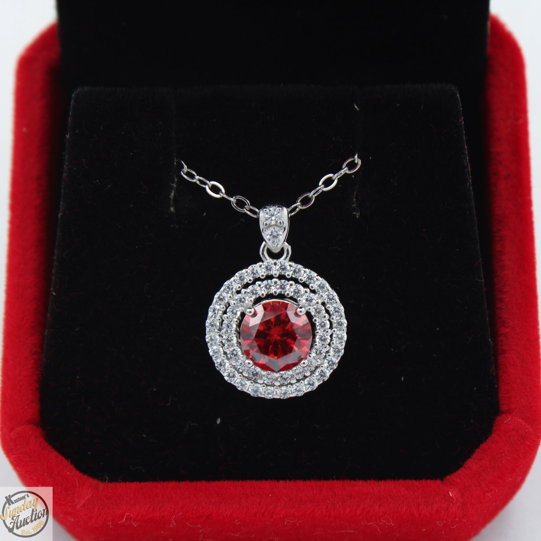 CUT MOISSANITE STONE VVS INTENSE RED COLOR WITH 50 ROUND BRILLIANT CUT CUBIC ZIRCONIA SET IN DUAL ROUND HALOS SET IN PENDANT SET IN 925 SILVER RETAIL VALUE $875.00 **ALL ITEMS MUST BE REMOVED BY 5PM SATURDAY, SEPTEMBER 20TH 2025. ALL REMAINING ITEMS WILL BE SUBJECT TO A $6.00 PER DAY STORAGE CHARGE. ANY ITEMS REMAINING AFTER MONDAY, OCTOBER 6TH 2025 WILL BE CONSIDERED FORFEITED. NO REFUNDS WILL BE ISSUED FOR FORFEITED ITEMS. TO SCHEDULE A PICK UP APPOINTMENT CLICK HERE