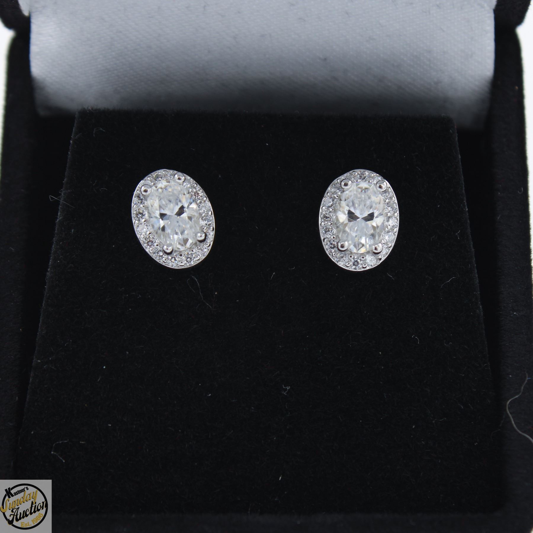 BRILLIANT CUT MOISSANITE STONES VVS D COLOR WITH 32 ROUND BRILLIANT CUT CUBIC ZIRCONIA SET IN OVAL SHAPED HALOS SET IN 925 SILVER EARRINGS RETAIL VALUE $750.00 **ALL ITEMS MUST BE REMOVED BY 5PM SATURDAY, SEPTEMBER 13TH 2025. ALL REMAINING ITEMS WILL BE SUBJECT TO A $6.00 PER DAY STORAGE CHARGE. ANY ITEMS REMAINING AFTER MONDAY, SEPTEMBER 29TH 2025 WILL BE CONSIDERED FORFEITED. NO REFUNDS WILL BE ISSUED FOR FORFEITED ITEMS. TO SCHEDULE A PICK UP APPOINTMENT CLICK HERE