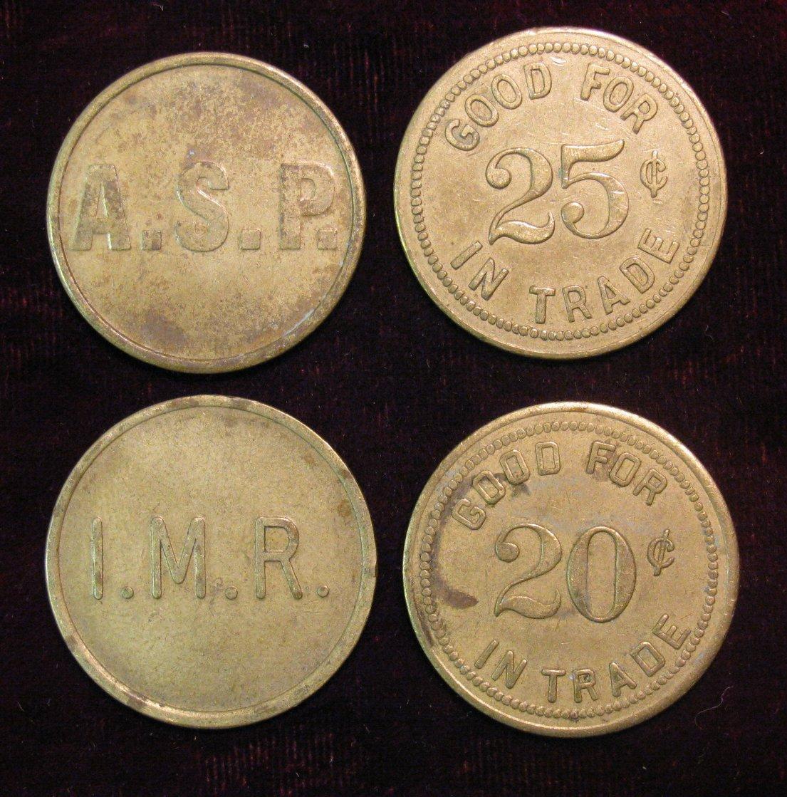 321. 4-Piece Anamosa State Prison Token Set. Includes "I.M.R.", "A.S.P.", "Good for 25c in Trade", & "Good for 20c in Trade".