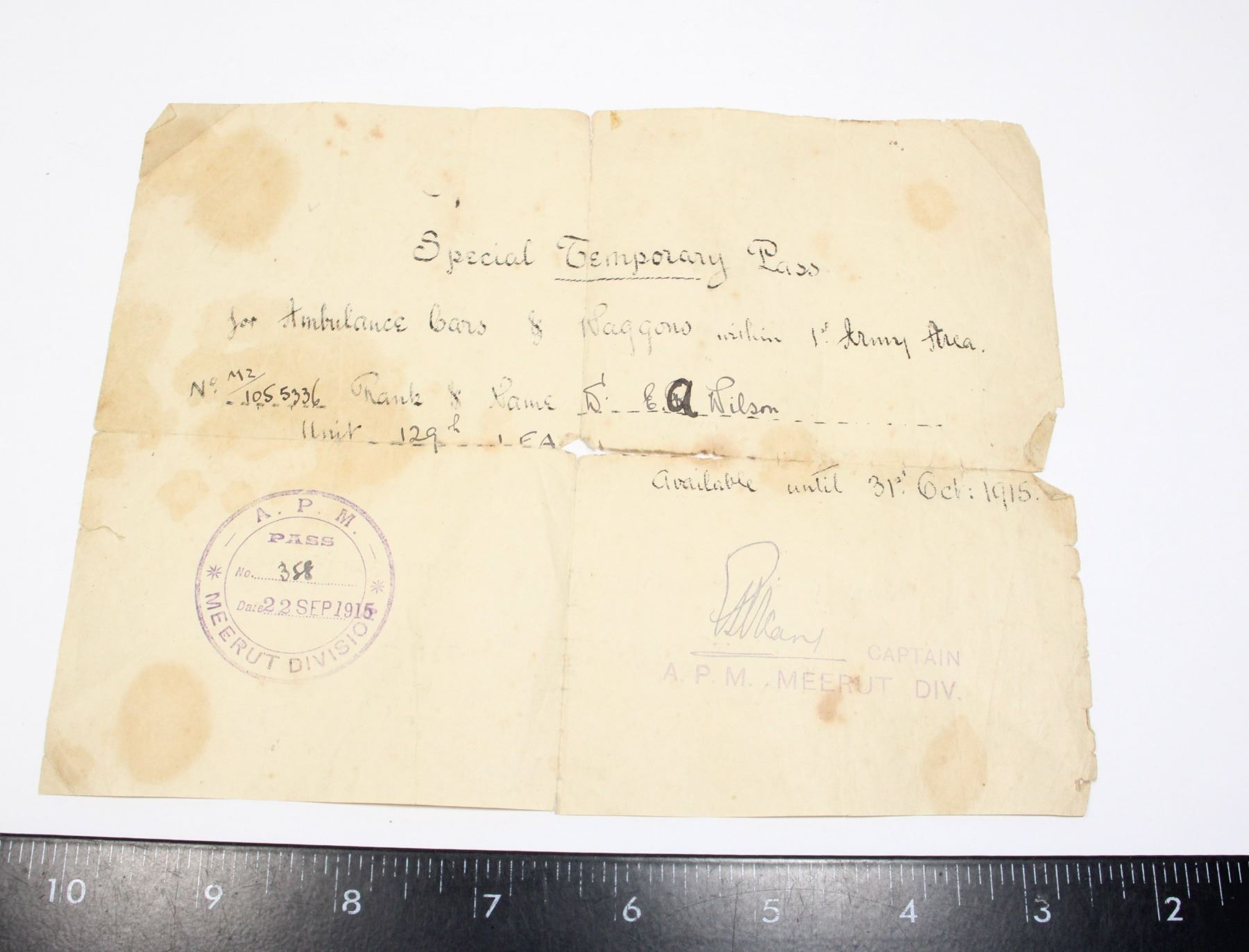 NAMED OCTOBER 1915 MEERUT DIVISION E.A. WILSON ALLIED FORCES DOCUMENT WORLD WAR ONE