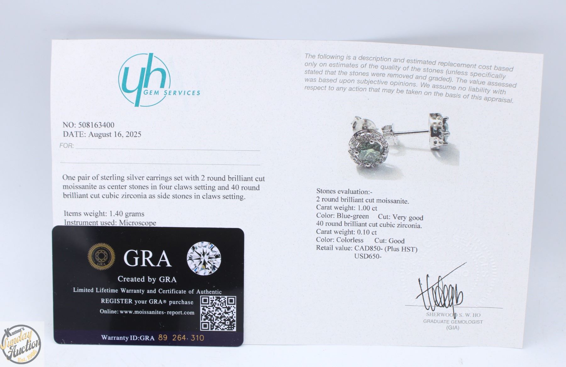 CUT MOISSANITE STONES VVS D COLOR WITH 40 ROUND BRILLIANT CUT CUBIC ZIRCONIA SET IN ROUND HALOS SET IN 925 SILVER EARRINGS RETAIL VALUE $850.00 **ALL ITEMS MUST BE REMOVED BY 5PM SATURDAY, SEPTEMBER 20TH 2025. ALL REMAINING ITEMS WILL BE SUBJECT TO A $6.00 PER DAY STORAGE CHARGE. ANY ITEMS REMAINING AFTER MONDAY, OCTOBER 6TH 2025 WILL BE CONSIDERED FORFEITED. NO REFUNDS WILL BE ISSUED FOR FORFEITED ITEMS. TO SCHEDULE A PICK UP APPOINTMENT CLICK HERE