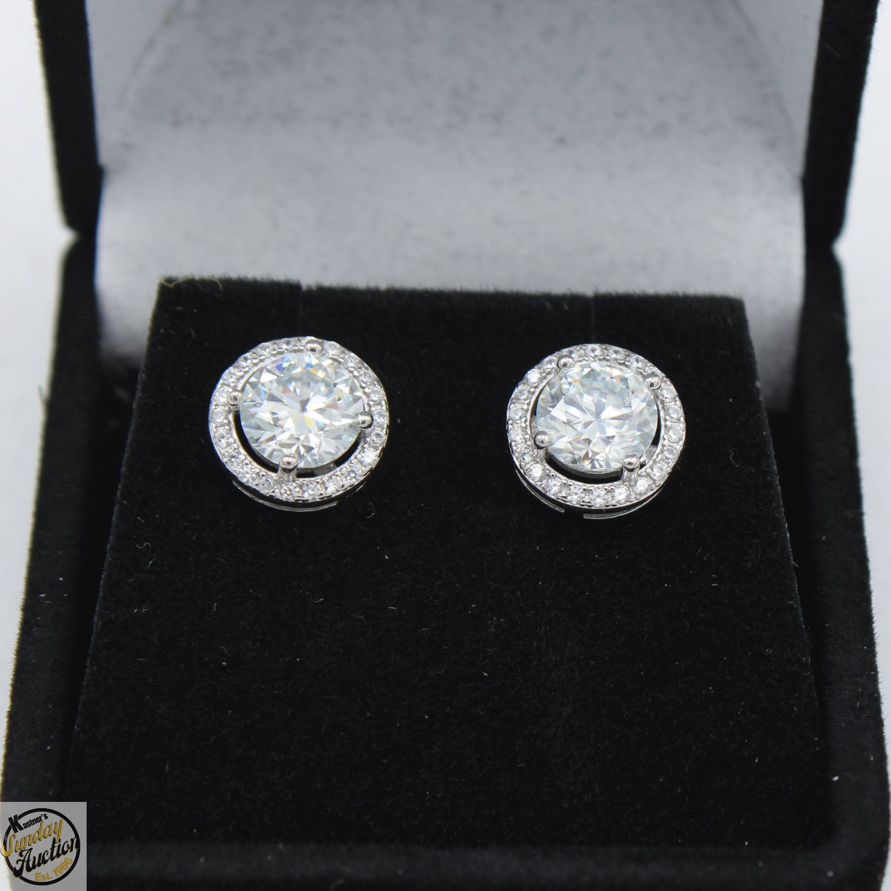 CUT MOISSANITE STONES VVS D COLOR WITH 40 ROUND BRILLIANT CUT CUBIC ZIRCONIA SET IN ROUND HALOS SET IN 925 SILVER EARRINGS WITH SCREW BACKS RETAIL VALUE $950.00 **ALL ITEMS MUST BE REMOVED BY 5PM SATURDAY, SEPTEMBER 13TH 2025. ALL REMAINING ITEMS WILL BE SUBJECT TO A $6.00 PER DAY STORAGE CHARGE. ANY ITEMS REMAINING AFTER MONDAY, SEPTEMBER 29TH 2025 WILL BE CONSIDERED FORFEITED. NO REFUNDS WILL BE ISSUED FOR FORFEITED ITEMS. TO SCHEDULE A PICK UP APPOINTMENT CLICK HERE