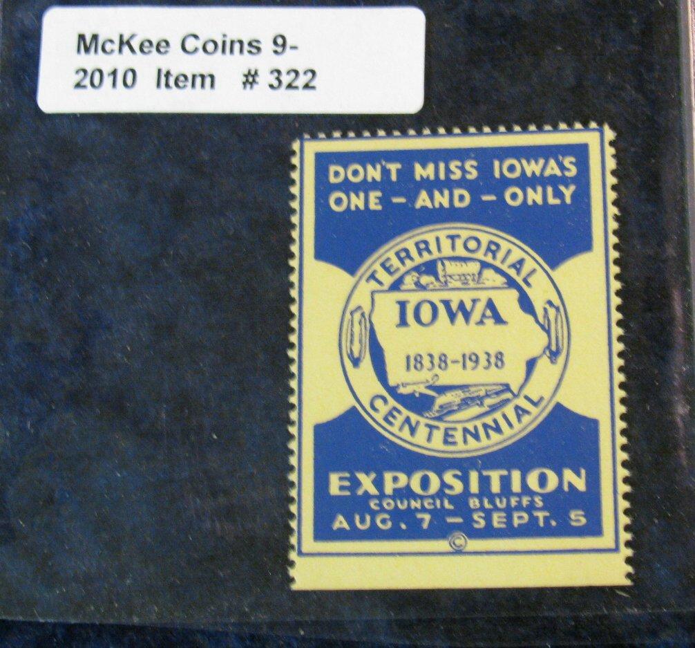 322. 1838-1938 Iowa Territorial Centennial Exposition Stamp. Mint condition.