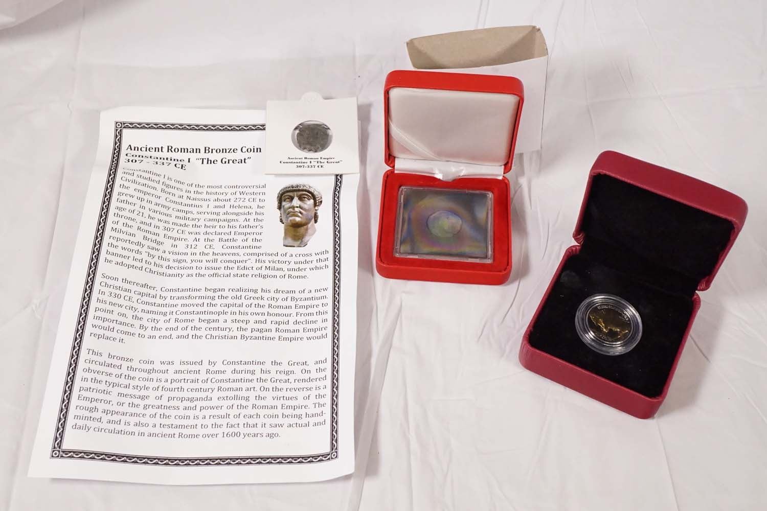 1 x 323 B.C. Alexamder the Great Hemiobal Type 1 Bronze 6.0 gms. in Special case and box w/sleave, 307-337 A.D. Constantine I AE-3 coin with information sheet, and a very special USA 5 cents Buffalo Nickel with selective GOLD-plating..